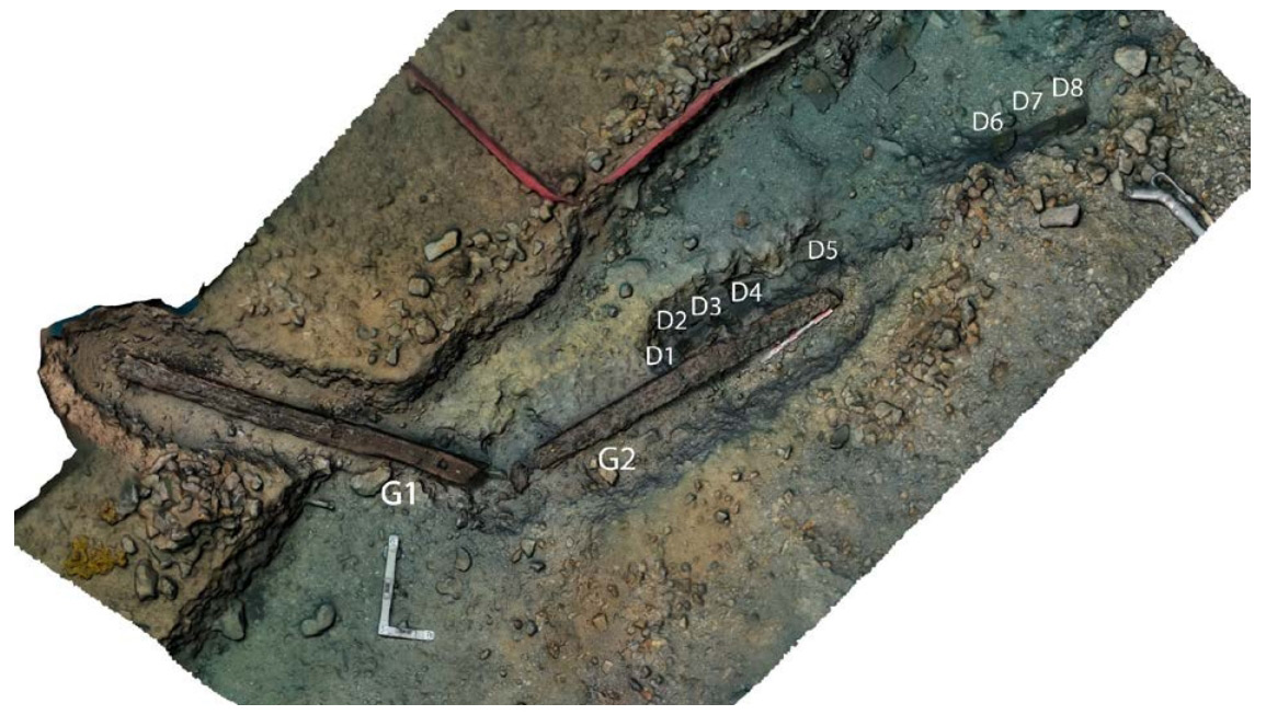 Na iskopanom području od 320 m² pronađeno je dvjesto arheoloških nalaza koji se mogu definirati i tipološki odrediti. Riječ je o različitim dijelovima amfora (grla tipa Portorecanati/Unije, bifidnim ručkama amfora tipa Dressel 2-4, globularna rebrasta tijela amfora tipa Late Roman 1, ulomci sjevernoafričkih amfora i tipa Spatheon), čepova amfora (izrađenih i na kolu i u kalupu), fino izrađenoj helenističkoj keramici crnog premaza (kupe i zdjelice sačuvane u cijelom profilu), keramici tipa terra sigillata (zdjelice i ulomci tanjura) te glaziranoj novovjekovnoj keramici proizvedenoj u sjevernoj Italiji (različiti uzorci boja i ureza na ulomcima zdjelica, vrčeva i većih posuda). Uz pokretne nalaze, tijekom iskopa u sektoru 3 pronađene su dvije veće grede dimenzija 4 m dužine i presjeka 30 x 30 cm, postavljene u smjeru izmjene plime i oseke. Grede su ojačane vertikalno postavljenim daskama i glinom žute boje koja se ne javlja na drugim mjestima na nalazištu. S obzirom na njihove dimenzije, vrlo vjerojatno su postavljene zato da usmjere morske struje u kanalu i učvrste lošinjsku stranu obale.