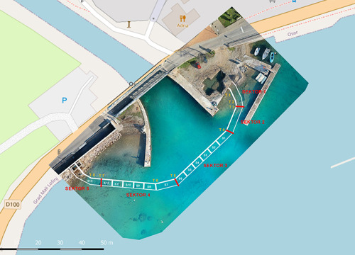 Sektor 1 i sektor 2 nalaze se na creskoj strani trase iskopa. S obzirom na to da je riječ o naknadno nasipanom području uz samu obalu, u sektoru 1 nisu pronađeni nikakvi arheološki ostaci, dok je u sektoru 2 pronađeno desetak drvenih pilona koji su učvršćivali kameni nasip. Slična situacija je i u sektorima 4 i 5, s tim da se sektor 5 nalazi uz samu obalu otoka Lošinja i uglavnom je nasipan krupnim kamenom. U sektoru 4 pronađeno je tridesetak drvenih pilona koji su učvršćivali lošinjsku obalu koja je muljevita i pjeskovita, za razliku od creske koja je kamenita. Razlog tome su morske struje koje su jače na creskoj strani, pa zato nema toliko taloženja sedimenata kao na lošinjskoj. Osim toga, kako je riječ o plovnom putu, kanal između Cresa i Lošinja često se mehanički čisti i produbljuje do 4 m dubine.