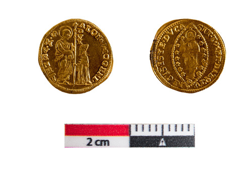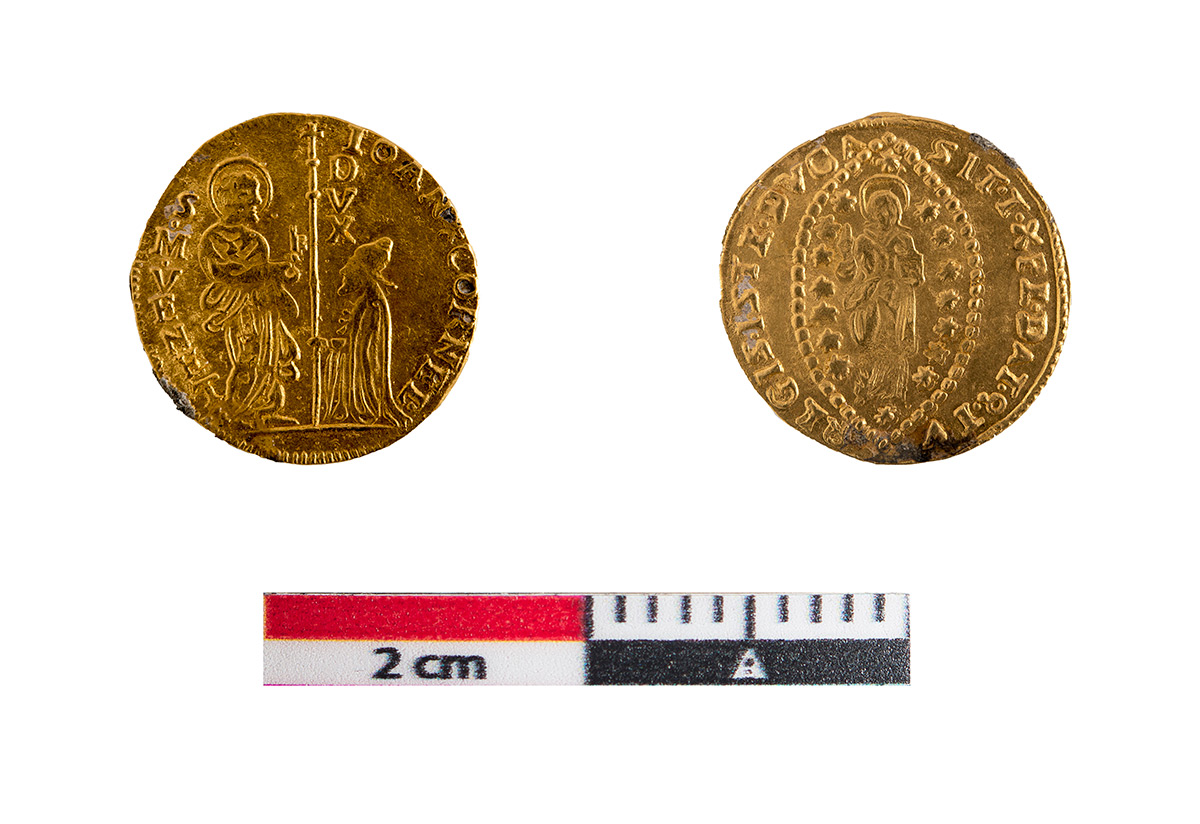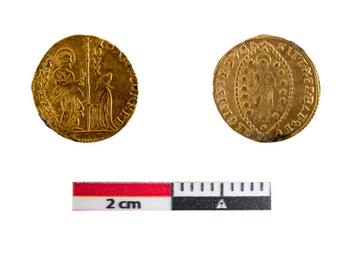 Nalazi koji su nam rasvijetlili ovaj brodolom su nalazi novca, posebno zlatnog. Dosad su nađena tri zlatna venecijanska dukata. Najraniji je zlatni dukat dužda Francesca Morosinija (1688. – 1694.) s natpisom FRAN MAVROC DVX S M VENET (avers), SIT T XPE DAT Q TV REGIS ISTE DVCA (revers). Taj je dužd možda najpoznatiiji po svojoj ulozi u Morejskome ratu (1684. – 1699.) kad je topovskom paljbom raznio Akropolu u Ateni kojom se osmanska vojska koristila kao barutanom. Druga dva pripadaju početku 18. st., jedan s prikazom dužda Alvisea II. Moceniga (1700. – 1709.) s natpisom ALOY MOCENI S·M·VENET· (avers), SIT·T·XPE. DAT.Q.TV REGIS·ISTE·DVCA (revers), dok drugi prikazuje dužda Giovannija II. Cornara (1709. – 1722.), s natpisom IOAN CORNEL· S·M·VENET· (avers), SIT·T·XPE·DAT·Q·TV REGIS·ISTE·DVCA (revers).