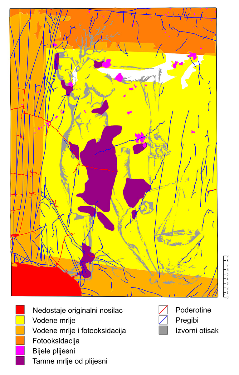Konzervatorsko-restauratorski radovi počeli su izradom pisane, fotografske i grafičke dokumentacije zatečenoga stanja; potom je utvrđen stupanj kiselosti papirnatog nosioca te su izrađene laboratorijske analize vlakana nosioca kojima je utvrđeno da su crteži izrađeni na različitim vrstama papira. Nosioci su zatečeni u različitom stupnju degradacije pa je za svaki crtež primijenjen drukčiji pristup. Provedeno je suho čišćenje i uklanjanje plijesni s površine nosilaca te njihova dezinfekcija, a zatim mokro čišćenje pojedinih umjetnina. Poderotine su konsolidirane, pojedini su crteži podloženi japanskim papirom te su izrađene dopune nedostajućih dijelova odgovarajućim papirima europske i japanske proizvodnje. Crteži su potom ovlaženi u komori i izravnati u hidrauličnoj preši; nakon toga je izveden retuš suhim pastelom. Papirnati nosilac neutraliziran je mokrim i suhim postupcima. Nakon izvedenih radova crteži su pohranjeni u opremu od beskiselinskog kartona. (AŠ, MBM)