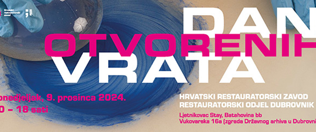 Pozivamo vas na Dan otvorenih vrata Hrvatskog restauratorskog zavoda u ponedjeljak, 9. prosinca 2024. godine, od 10 do 18 sati na lokacijama ljetnikovac Stay, Batahovina bb i Vukovarska ulica 16 a u Dubrovniku.