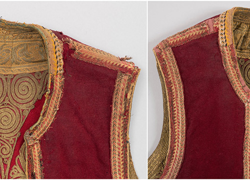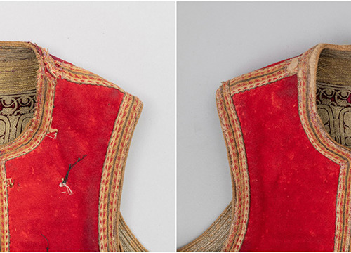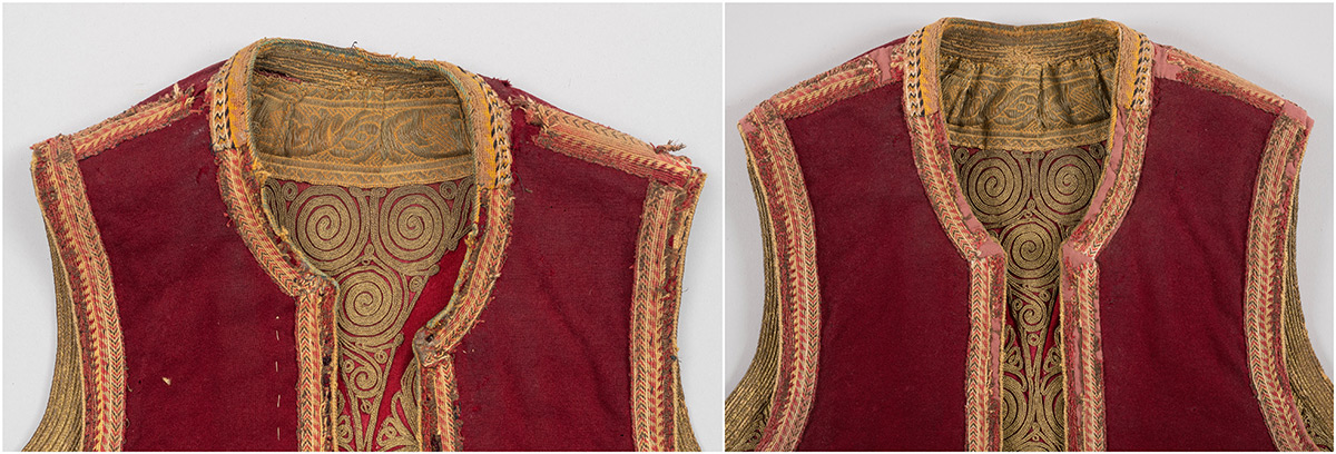 U 2023. godini za dva muška prsluka (DUM EM 3657 i 4799) izrađena je fotografska, grafička i pisana dokumentacija zatečenog stanja. Konzervatorsko-restauratorski radovi obuhvatili su uzorkovanje tekstilnih i metalnih niti za kvalitativnu analizu, suhi postupak čišćenja te djelomično odvajanje dijelova predmeta. Nabavljene su nove tkanine za podlaganje oštećenja. Na oba prsluka sanirana su mjesta oštećenja na podstavnim tkaninama i tkanim trakama. U 2024. godini nastavljeni su konzervatorsko-restauratorski radovi, a za sanaciju mjesta oštećenja šivanjem na novim je tkaninama postignut odgovarajući ton obojenja. Izvedena je sanacija oštećenja glavnih tkanina, terzijskog veza, ukrasnih galun traka i tkanih traka šivanjem kombiniranim restauratorskim bodovima. Očišćeni su metalni dijelovi te je izrađena fotografska i pisana dokumentacija tijekom radova. Nabavljene su kutije od beskiselinskog kartona za pohranu i transport.