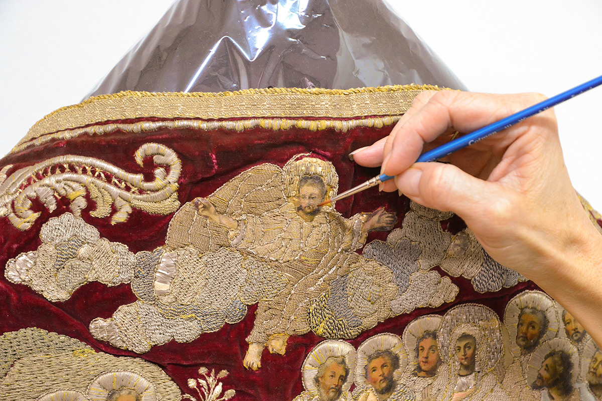 Na felonu s prikazom Uzašašća Kristova 2022. godine izvedeni su cjeloviti konzervatorsko-restauratorski radovi (voditeljica: Sandra Lucić Vujičić, Odjel za tekstil, papir i kožu, Služba za pokretnu baštinu). Dokumentirano je i analizirano zatečeno stanje izradom fotografske i grafičke dokumentacije, predmet je povijesnoumjetnički obrađen te su provedene laboratorijske i tehničke analize. U Prirodoslovnom laboratoriju Zavoda dokazano je košenilno bojilo niti osnove vlaska baršuna s oplećja. Posebno je analizirano bojilo crne broché potke temeljne tkanine prije izvođenja mokrog čišćenja: papirnatim trakicama (Iron Gall Ink Test Paper) u potki su detektirani štetni ioni željeza II, a jednostavnim probama je utvrđeno da je bojilo postojano u negrijanoj destiliranoj vodi. Analize izvedene na Tekstilno-tehnološkom fakultetu i Zavodu za tekstilnu kemiju i ekologiju potvrdile su postojanje močila željezova (II) sulfata – FeSO4 · 7H2O (zelena galica), a za crnu broché potku navodi se da je vjerojatno obojena prirodnim bojilima od biljaka bogatih taninom. S predmeta su odvojene lanena podstava i široka posrebrena traka te završno oplećje od temeljne tkanine. Najizraženije krupne nečistoće zatečene na donjem rubu felona uklonjene su pincetama.