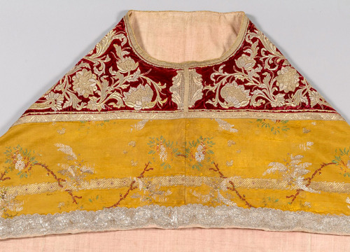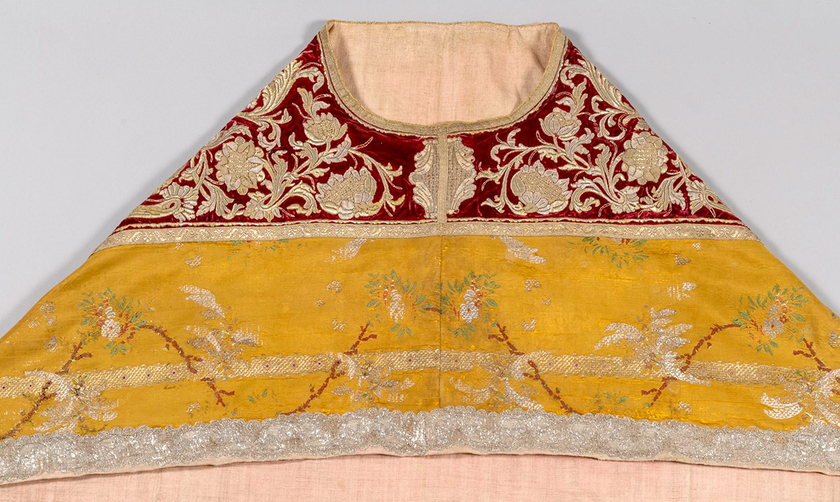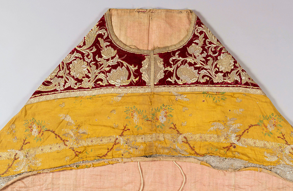 Temeljna tkanina felona je zlatnožuti lamirani i broširani lampas na koji je na dijelu oplećja prišiven vezeni umetak purpurnoga svilenog baršuna. Broché potke temeljne tkanine tvore motive karakteristične za navedeno razdoblje, a riječ je o okomitim trakama s cvjetićima preko kojih se uvijaju tanke grančice s dvije vrste cvjetnih buketića. Na baršunu oplećja je tehnikama sviloveza i zlatoveza preko podloge izrađen prikaz Uzašlog Krista u trenutku ukazanja Bogorodici i apostolima. Glavni prikaz okružen je motivima traka, grana i cvjetova. Posebna je pozornost posvećena oblikovanju okoliša vezenih figura upotrebom različitih posrebrenih, pozlaćenih, frisé i raznobojnih svilenih niti. Inkarnat figura oslikan je uljanim bojama na svilenom ripsu te podložen tanjim kartonom. Vezeni baršun ima međupodstavu od lanenog platna. Na felonu su zatečene četiri vrste metalnih traka prišivene uz vratni izrez, na dnu oplećja i na donjem rubu felona, a od posljednje je izrađen mali romb na dnu stražnjeg dijela. Okrugli dio vratnog izreza zarubljen je pozlaćenom uvijenom uzicom. Felon je podstavljen blijedoružičastim lanenim platnom s bijelom pamučnom kepernom vrpcom za vezanje.