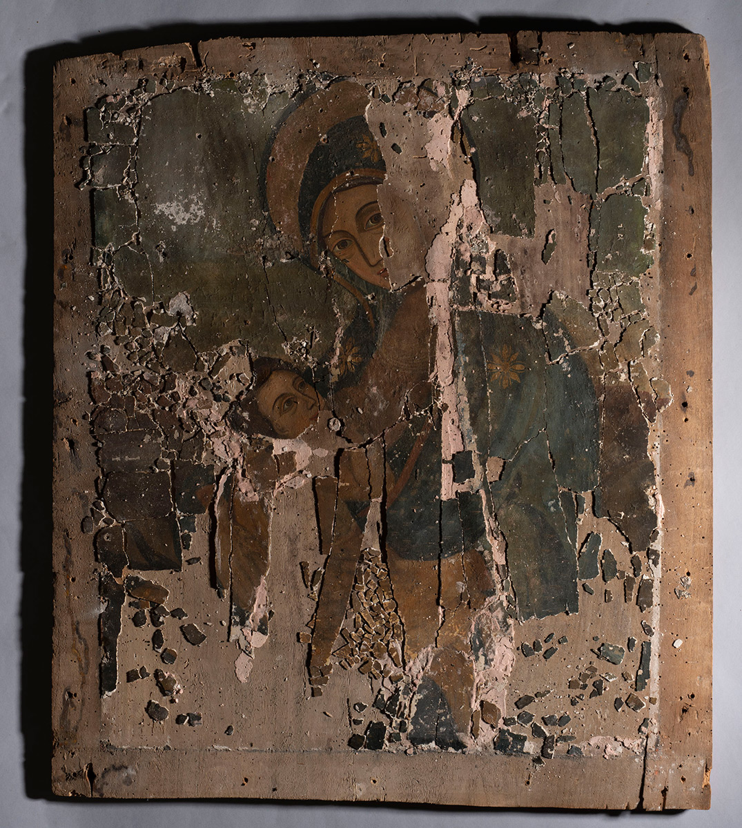 Budući da je zbog navedenih oštećenja bila potrebna hitna intervencija, fokus rada na ikoni bio je na pronalaženju najboljega konsolidanta kako bi se na nosiocu sačuvalo što više fragmenata te da bi se ikonu potom moglo dalje istraživati i sagledavati u kontekstu s okvirom. Prije konsolidacije, ucrtano je zatečeno mjesto svakog fragmenta. Sitniji fragmenti potom su premješteni na spomenutu mapu, dok su fragmenti pohranjeni u kutijicama kategorizirani po tonalitetu i veličini. Takvim pristupom željelo se sačuvati i izložiti sve fragmente koji se ne mogu vratiti na nosilac te će se u daljnjem radu definirati i način prezentacije svih sačuvanih dijelova ikone. Ružičasti kit koji je zaostao na ikoni kao trag neke prijašnje intervencije uklonjen je mehanički, a mrvice preparacije, prašine i spora gljivica s površine slikanog sloja vlažnim kistom. Kit se vjerojatno upotrebljavao za lijepljenje fragmenata koji su tada počeli otpadati, no fragmenti koji su bili zalijepljeni kitom bili su mjestimično preklopljeni i teško čitljivi te nisu bili na pravom mjestu. Također su podlijepljeni i najosjetljiviji dijelovi bojenog sloja. Nakon odabira konsolidanta i metode lijepljenja (injektiranje), započet je zahtjevan proces lijepljenja fragmenata na drveni nosilac.