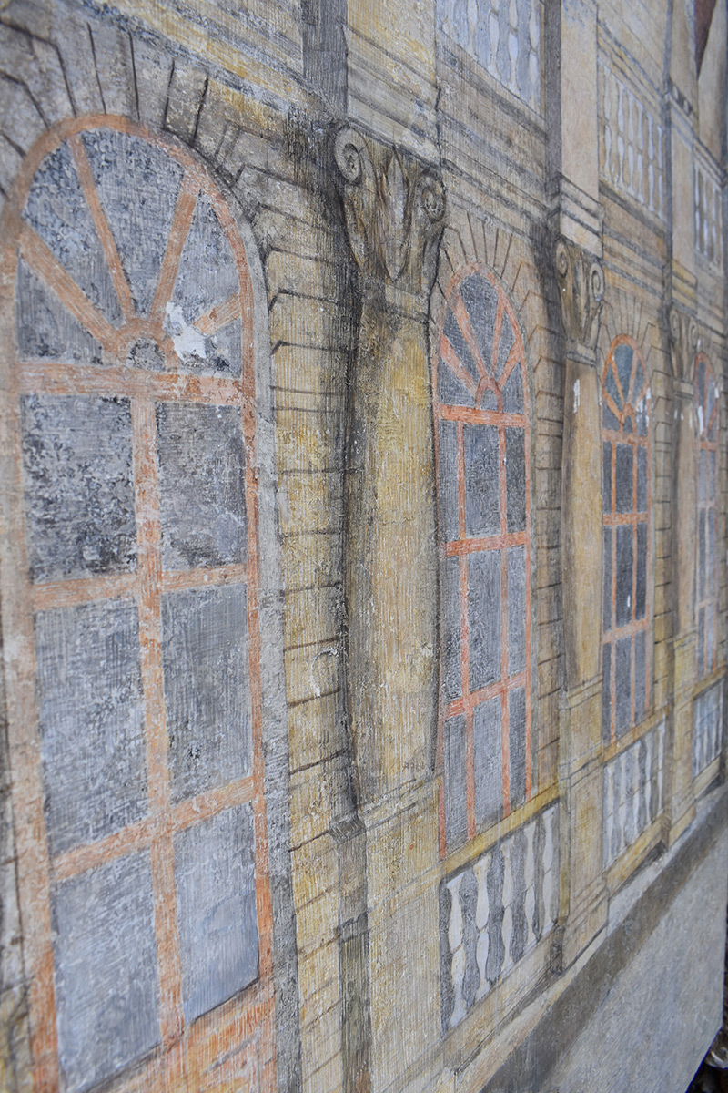 Tijekom konzervatorsko-restauratorskih radova koje je 1989. godine izveo Restauratorski zavod Hrvatske, na istočnom zidu pozornice otkrivena je starija zidna slika koju je pri obnovi kazališta za karnevalske svečanosti 1819. godine naslikao Petar Galasso. Zbog prezentacije obiju zidnih slika, koje predstavljaju scenografsku dekoraciju pozornice, novija zidna slika odvojena je od zidne površine i premještena na prijenosnu podlogu u pet odsječaka.