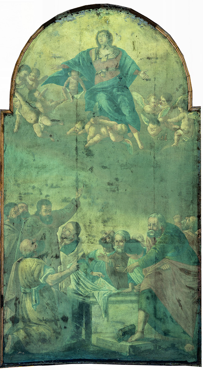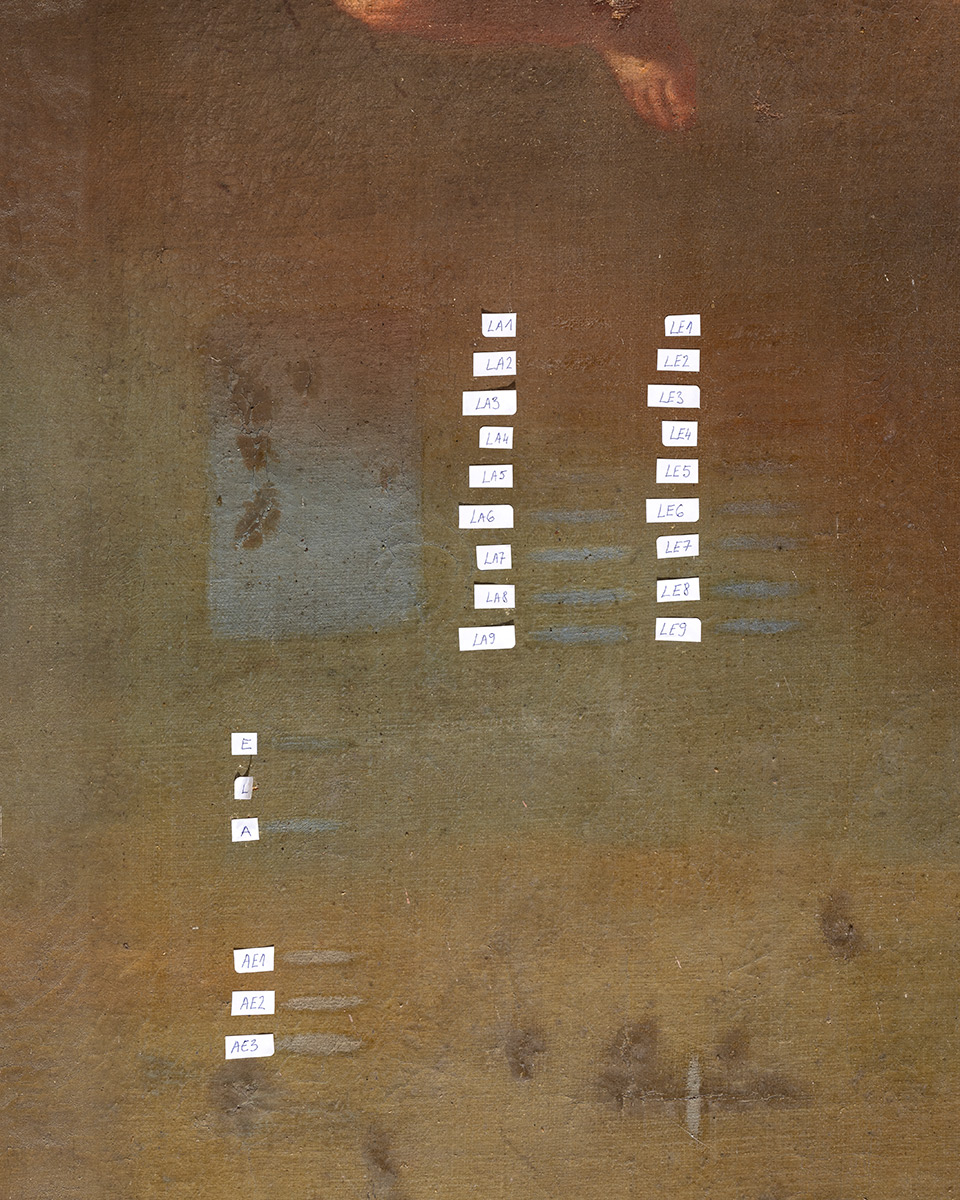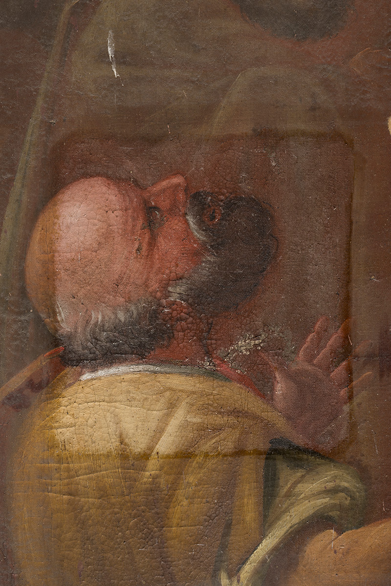 Detaljnim konzervatorsko-restauratorskim istraživanjem utvrđeno je izrazito loše stanje slike: deformirano i opušteno platno, požutjeli oksidirani lak, potamnjeli stari retuši i brojna mehanička oštećenja. Poseban problem činilo je prekomjerno opterećenje donjeg dijela slike zbog urušavanja žbuke iza platna, što je još više naprezalo nosilac. Mikropresjeci uzoraka, rendgenska fluorescentna spektroskopija i FT-IR analiza potvrdili su primjenu karakterističnih baroknih pigmenata i prirodnog mastiksa kao veziva i završnog laka.
