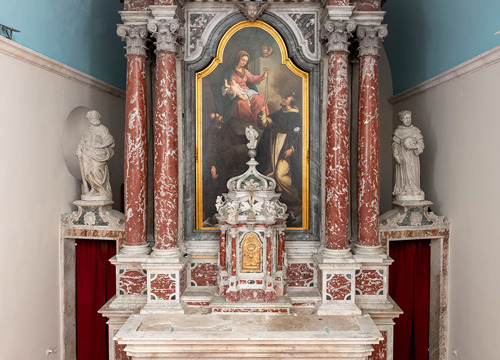 Na sredini antependija oltara je medaljon s volutama i lepezastim ukrasom na vrhu. Središnji dio medaljona isklesan je u zelenom mramoru, dok je površina antependija od crveno-bijelog mramora. Na pravokutnim bazama dižu se sa svake strane po dva stupa od crvenog mramora koji završavaju kompozitnim kapitelima. Na retablu oltara, između stupova, nalazi se oltarna niša iznad koje je glava anđela i mramorni baldahin, iznad kojega je postavljena golubica.