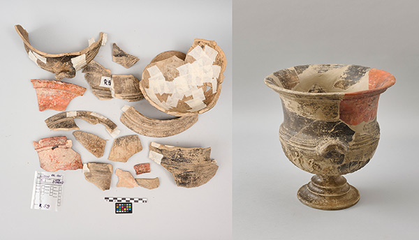Nakon čišćenja, predmeti su strukturalno konsolidirani odgovarajućim sredstvom. Ulomci su potom preliminarno lijepljeni krep-trakom te trajno ljepilom za arheološku keramiku. Za integraciju je upotrijebljen alabasterni gips. Reljefni ukrasi su rekonstruirani uzimanjem otisaka originala zubarskim silikonom. Nakon obrade ručnim alatom i ponovnog čišćenja, gips je nijansiran akrilnim bojama nekoliko nijansi svjetlijim tonom od izvorne boje, da bi se vidjela razlika između originalnih i rekonstruiranih dijelova. Nekoliko predmeta nije imalo nožicu ili obje ručke te se kod takvih predmeta nije pristupilo rekonstrukciji dijelova koji nedostaju.