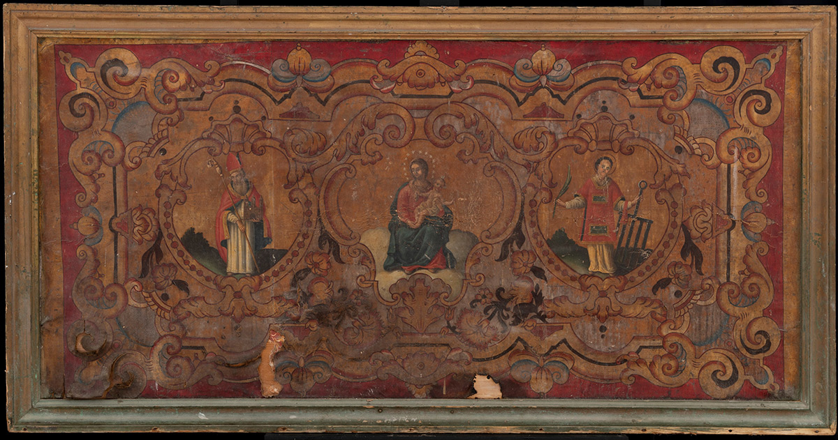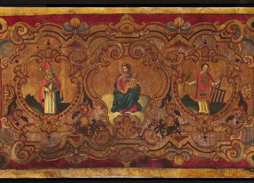 Uljanim bojama na kožnatom nosiocu predoltarnika naslikana su tri medaljona unutar okvira od florealnih motiva. U središnjem medaljonu prikazana je Bogorodica s Djetetom, a u bočnim medaljonima su sv. Ivan Trogirski i sv. Lovro.