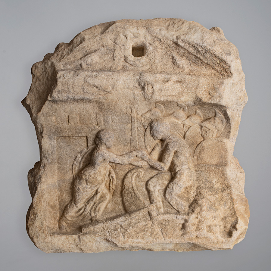 Dok zabat ne odudara previše od standardne produkcije, reljefno polje – koje je od zabata odijeljeno uskom uokvirenom trakom koja sadrži oštećene figuralne prikaze, čini se također ptice – svakako se razlikuje od uobičajenih scena. Taj najvažniji ukrasni motiv na steli ujedno je i najbolje očuvani dio fragmenta, pa nema pretjeranih poteškoća u prepoznavanju pojedinih elemenata reljefa. Lijevim dijelom dominira prikaz utvrđenoga grada, čini se smještenog na nekoj uzvisini ili brežuljku. Osim bedema, jasno se naziru i monumentalna gradska vrata, pa možemo zaključiti da je riječ o nekom važnom naselju. Ispod bedema, desno od vrata, također na lijevoj strani reljefa, prikazom dominira ženska figura u hitonu s plaštom (himatijem) prebačenim preko ramena, koji joj obavija tijelo od bokova naniže i čiji jedan skut ona drži u lijevoj ruci. Žena je prikazana u profilu i u pokretu, kako prelazi dasku koja s pristaništa vodi prema brodu. Brod zauzima desnu stranu reljefa, no jasno su mu vidljive samo krma i oplata, jer tim dijelom scene dominiraju ljudi koji stoje na brodu. Dominantan je lik muškarca koji ženi pruža obje ruke i hvata je za desnicu. Može se pretpostaviti da joj pomaže da se ukrca na brod. On i žena nesumnjivo su glavni likovi kompozicije: polugol je, odnosno nosi samo subligaculum (pokrivalo za genitalije i bedra), što nije neuobičajeno za pomorca, no nosi i plašt, što pak simbolički upućuje na njegovu herojsku ulogu. Iza njega možemo nabrojiti četiri ratnika, naizgled jednako opremljena (okrugli štitovi i kacige s perjanicama). U desnom donjem dijelu reljefnog prikaza naziru se manje ljudske figure koje plivaju u moru uza sam brod. Moguće je riječ o prikazu Tritona, čime se simbolički dočarava more.