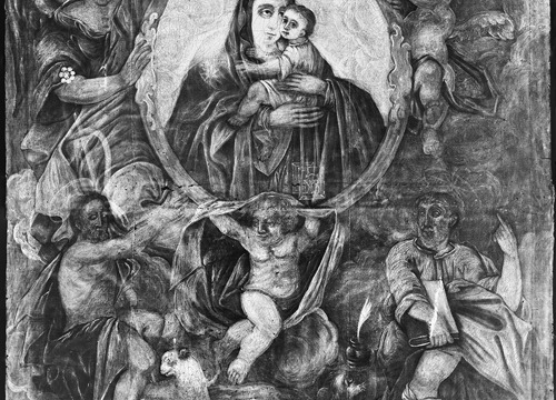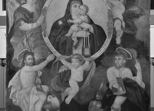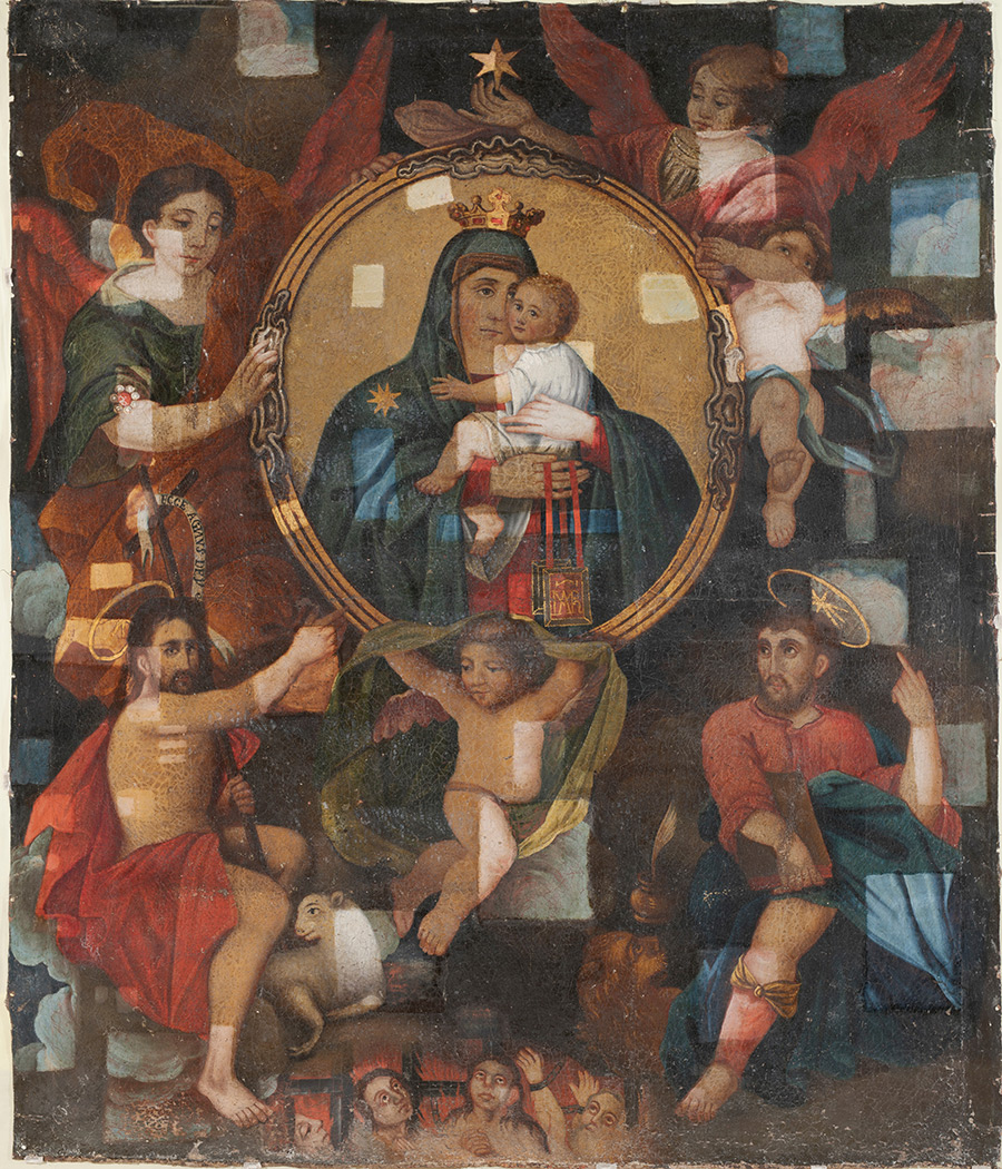 Istraživački radovi upućuju na to da su okvir unutar slike koji pridržavaju dva anđela, kruna iznad glave Gospe Karmelske te aureole sa zvijezdama iznad glava svetaca izvedeni zlatnim listićima. Dodatnim konzervatorsko-restauratorskim istraživanjima, tijekom kojih je snimljen rendgenogram, ustanovljeno je da je slika u cijelosti preslikana, pri čemu nije mijenjan ikonografski sadržaj. Likovi na slici preslikani su u jednom sloju, a pozadina likova s oblacima preslikana je dva puta.