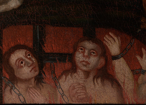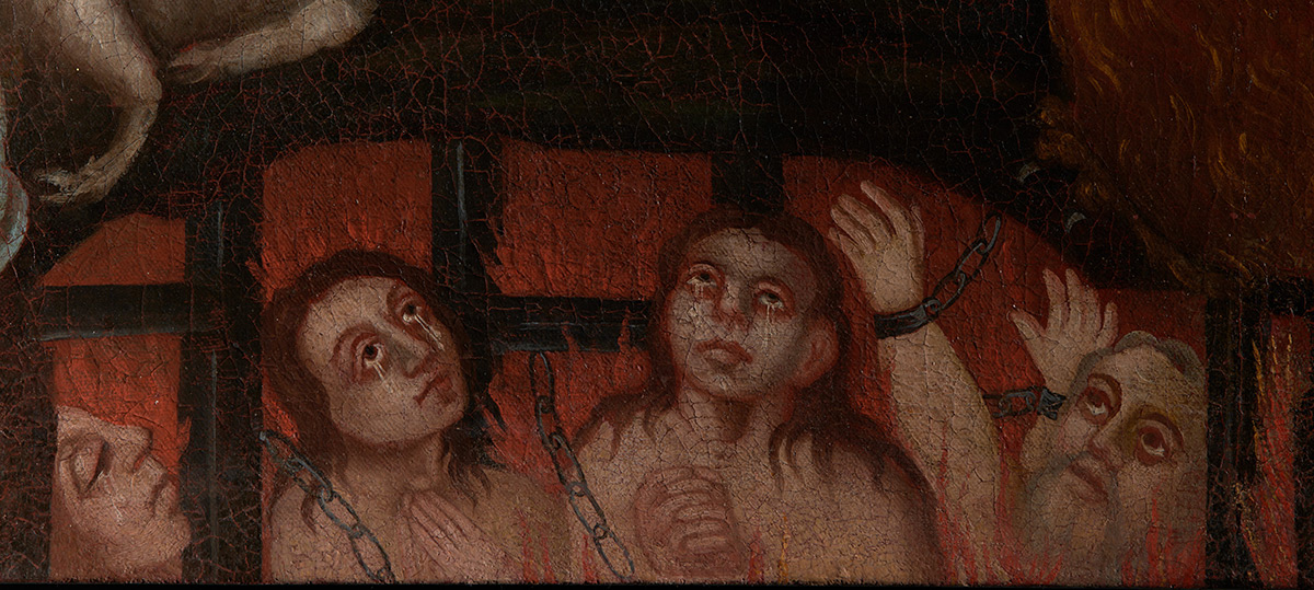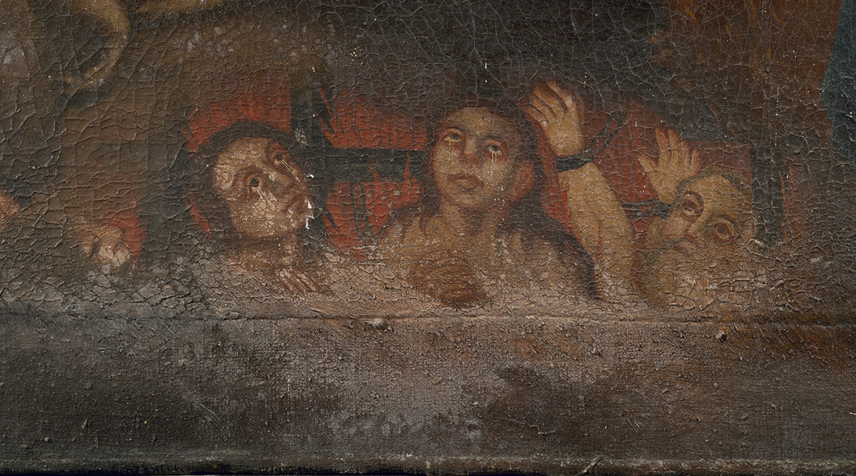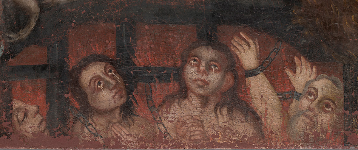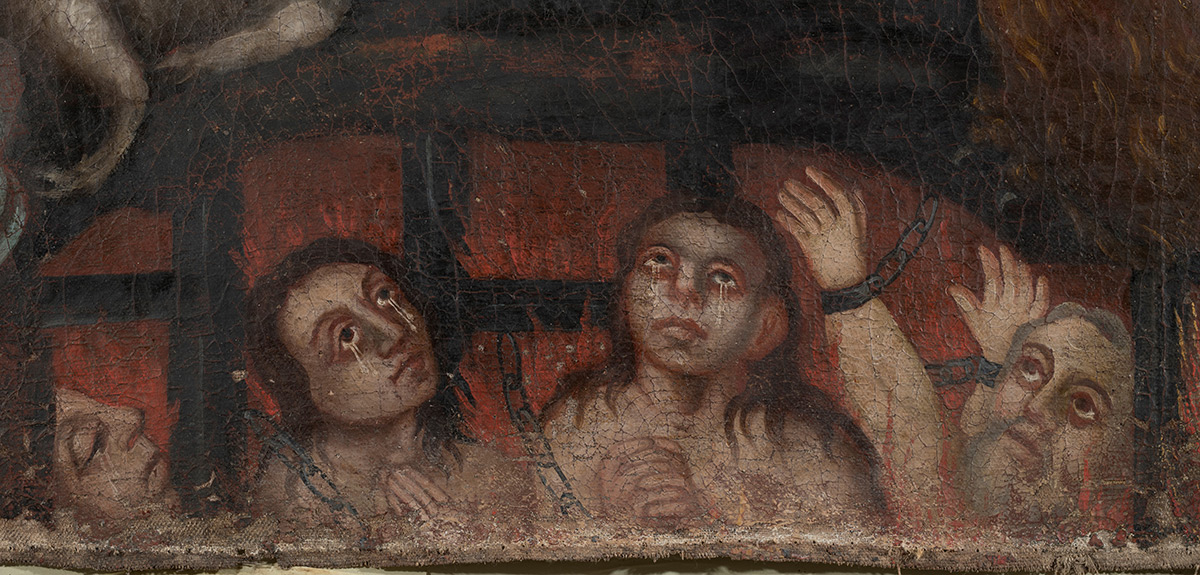 Nakon uklanjanja naslaga prljavštine, starog požutjelog laka i naknadnih rekonstrukcija oslika na donjem, izvornom rubu platna, postao je u cijelosti vidljiv originalni prikaz čistilišta. Nedostajući dijelovi nosioca su sanirani i nadoknađeni intarzijama. Rekonstrukcija dijelova podloge, kao i oštećena mjesta, izvedena je akrilnim kitom imitirajući teksturu originala. Nakon podstavljanja slike novim lanenim platnom, slika je napeta na novoizrađeni drveni podokvir. Mjesta na kojima je nedostajao slikani sloj, kao i rekonstruirani dijelovi podloge, tonski su podložena gvaš bojama. Dijelovi izvorno izvedeni zlatnim listićima rekonstruirani su zlatom u prahu. Nakon nanošenja izolacijskoga laka, izveden je završni retuš restauratorskim smolnim bojama imitirajući okolni original, a potom je na sliku nanesen završni sloj laka u spreju. (RMŠ)