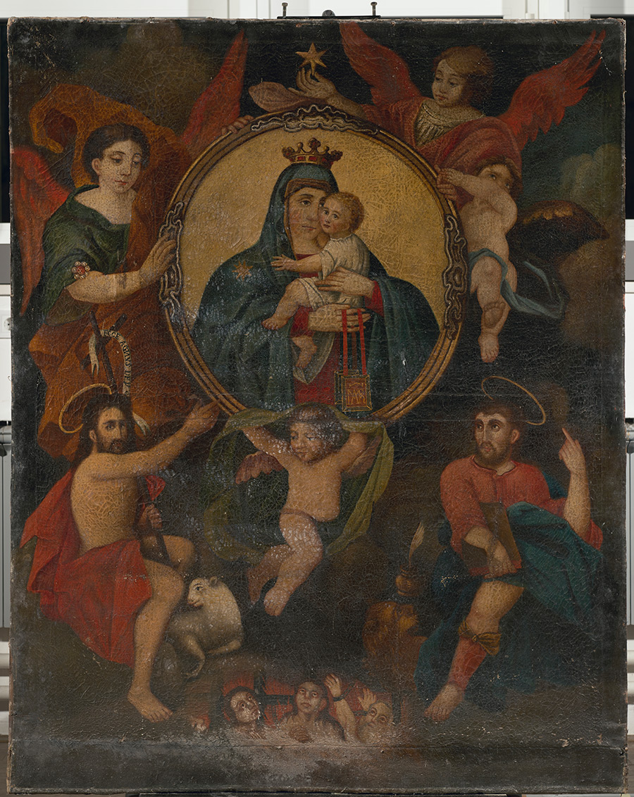 Konzervatorsko-restauratorski radovi na slici „Gospa Karmelska“ provedeni su od 2022. do ožujka 2023. godine (voditeljica: Renata Majcan Šragalj, viši konzervator-restaurator, Odjel za štafelajno slikarstvo 1, Služba za pokretnu baštinu). Slika je izrađena tehnikom ulja na platnenom nosiocu, gustog tkanja i tanjih lanenih niti. Platno je zatečeno izrazito krto, opušteno i mjestimice valovito, a na licu slike ocrtavao se podokvir. Oslik je bio prekriven slojem nečistoće i potamnjelog laka, s vrlo izraženim mrežasto ispucanim pukotinama u formi žličastih deformacija koje su na rubovima bile odignute i izrazito krte. Oštećenja su bila vidljiva na cijeloj površini – slikani sloj se odvajao od podloge te je mjestimično nedostajao, dok je u donjem dijelu platna ispucao. Bile su vidljive i prijašnje intervencije u slikanom sloju.