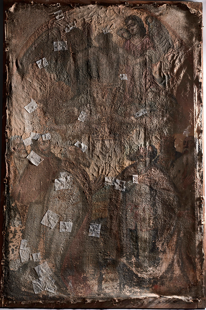 Slikani sloj je cijelom površinom bio ispucan, izrazito rasušen i odignut od nosioca te u donjem dijelu sipak zbog gubitka veziva. Oštećenja slikanog sloja s gubicima bila su vidljiva na cijeloj površini slike, ali najviše u podnožju, gdje su oslikane forme bile teško sagledljive. Oštećenja i gubici izvorne podloge bili su prekriveni voštanim ispunama i debelim namazima višekratnih preslika.