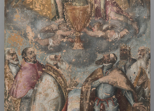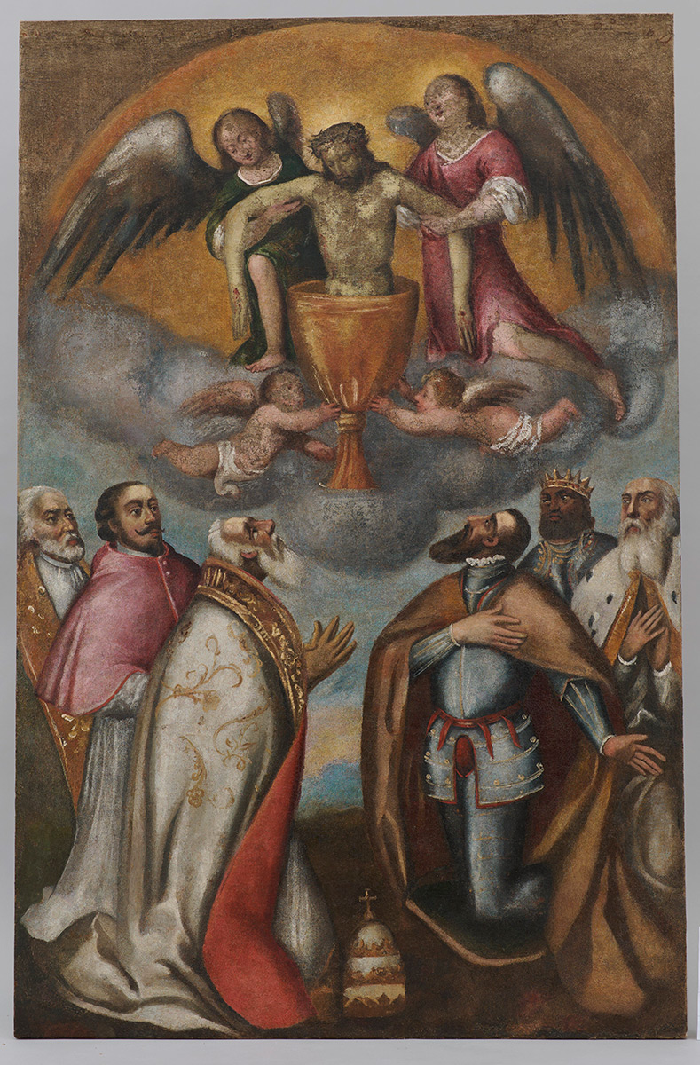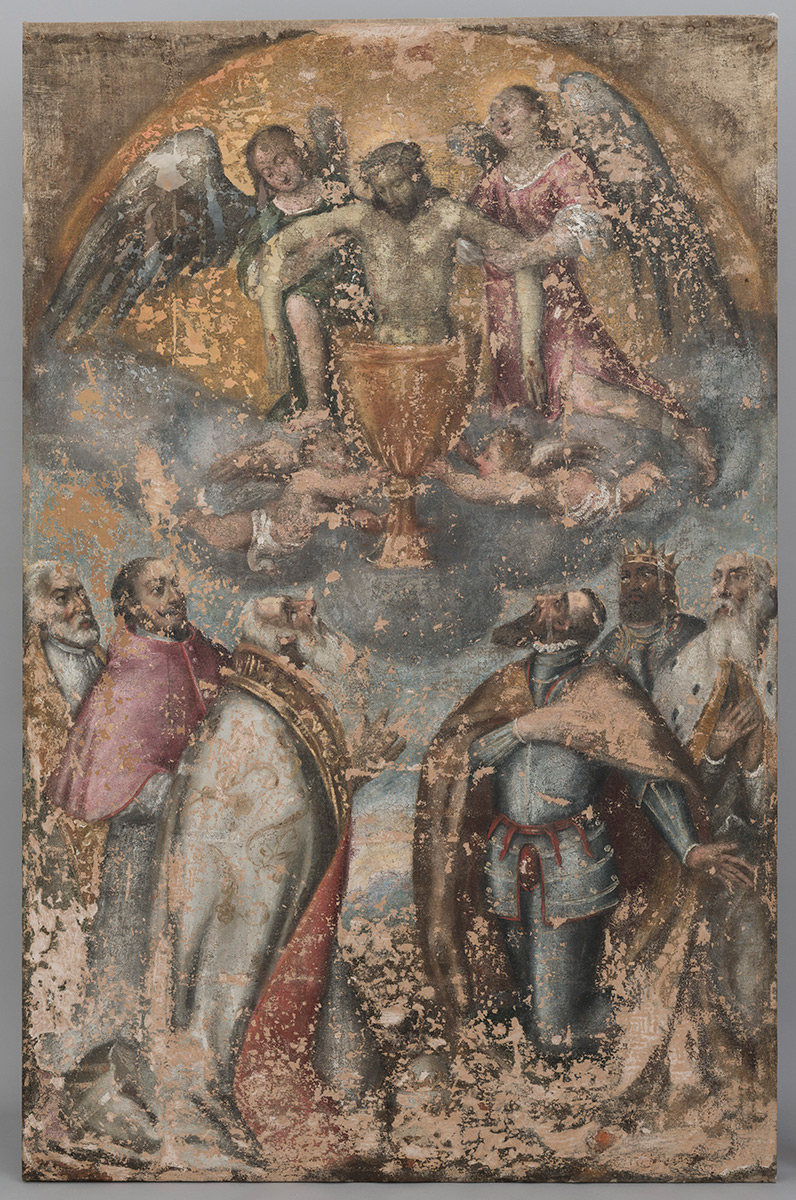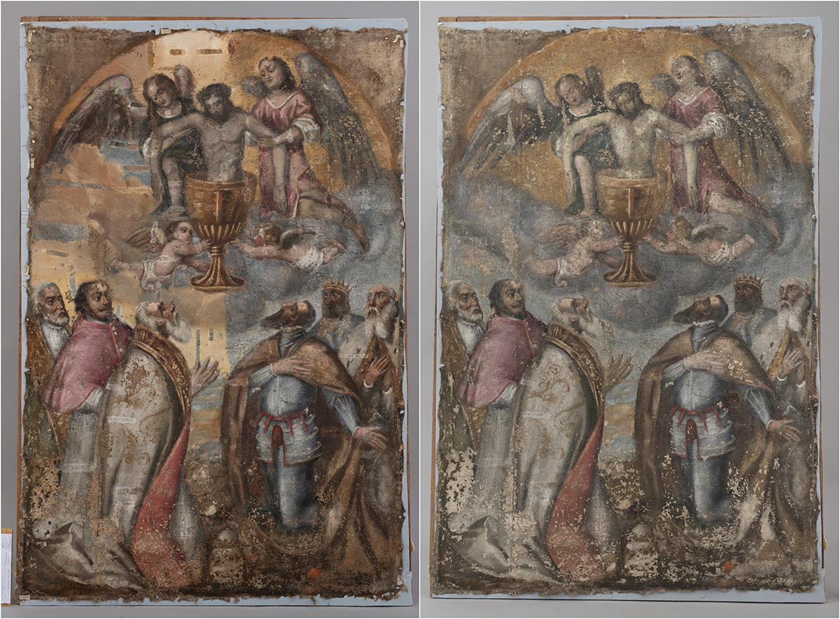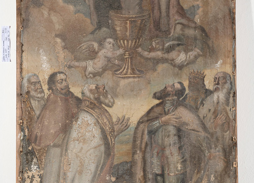 Usporedbom stanja očuvanosti slikanih slojeva vidljivih na rendgenskoj snimci sa zatečenim stanjem, potvrđena je loša očuvanost detalja lica u donjem dijelu slike; stoga je odlučeno da se na gornjem dijelu slike (na kojemu je prikazano tijelo Kristovo uronjeno u kalež) preslik ukloni, a u donjem (na kojemu su prikazani predstavnici crkvene i svjetovne vlasti) djelomično zadrži.
