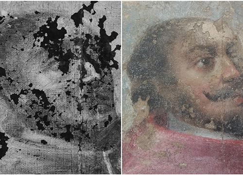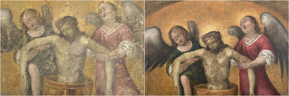 Usporedbom rendgenske snimke i zatečenog oslika bio je vidljiv potpuno izmijenjen položaj glave desnog odraslog anđela. U izvornom sloju, glava i pogled usmjereni su prema nebu, dok je u presliku glava bila predimenzionirana, a pogled poluzatvorenih očiju i oborene glave usmjeren prema Kristovu tijelu. Kristovo čelo je u izvornom sloju više i naglašenije, dok je trnova kruna elegantnije naslikana i ne dominira, za razliku od krune na zatečenom osliku. Zatečeni pastozni preslici lica posve su promijenili karakter prikazanih figura, što je primjetno i u donjem dijelu slike na drugom liku s lijeve strane, koji ima bujnu kosu, brkove i bradu, dok rendgenska snimka otkriva golo lice mršavih obraza i kratke kose.