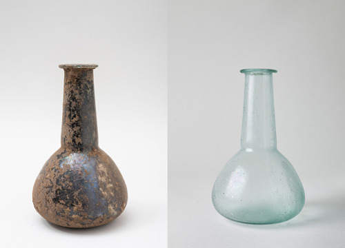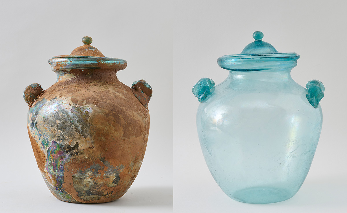 Nađeni su i brojni stakleni predmeti, dijelom potpuno očuvani, samo prekriveni zemljom i kalcifikatom. Takvi se predmeti najprije peru i čiste mekim četkicama; slijedi čišćenje blagom kiselinom radi uklanjanja kalcifikata. Fragmentirani predmeti su spajani, lijepljeni i rekonstruirani. Više stotina staklenih predmeta čine staklene urne, boce, balzamariji, čaše, posudice i tanjuri.
