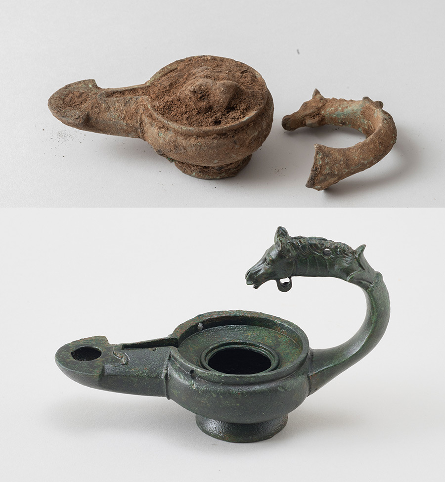 Brončani predmeti mehanički su čišćeni od korozije skalpelom pod binokularnim povećalom, mikropjeskarnikom, mikromotorom ili ultrazvučnom iglom. Predmeti od više ulomaka su lijepljeni, rekonstruirani te završno zaštitno premazani. Dvjestotinjak manjih i većih predmeta čine fibule, igle, strigili, posudice, lampice, prstenje i novac.