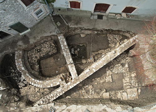Većina arheoloških zona nalazila se unutar gradskih zidina, dok je tek nekoliko na području s njihove vanjske strane. Najraniji slojevi grada potvrđeni su nalazima prapovijesne keramike, među kojima se ističu nalazi južnoitalske daunijske keramike s crno slikanim geometrijskim motivima, kao i nalazom željeznodobnog ukopa s prilozima (spiralne naočalaste fibule i nekoliko jantarnih perli). Najviše nepokretnih nalaza, jasne namjene, potječe iz rimskog razdoblja (1. – 3. st.). Zasigurno se ističe rimski toalet (latrinum) ubiciran u JI dijelu naselja, koji je dio većega kompleksa, vjerojatno termi. Također, unutar toga kompleksa, djelomično je očuvana podnica od opeke izrađena u tehnici opus spicatum. Još jedan kompleks, slične namjene, pronađen je u JZ dijelu naselja, uz vrt biskupskoga dvora, sa zapadne strane. Riječ je o kompleksu s grijanim prostorijama (hipokaust) i bazenima, a uz jedan kružni bazen pronađeni su in situ tubulusi, što potvrđuje da je bazen bio grijan. Dio toga kompleksa bio je i odvodni kanal (cloaca) koji je, osim uz navedene prostorije, pronađen i u kanalu otvorenom na parkingu uza zapadni bedem.