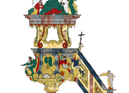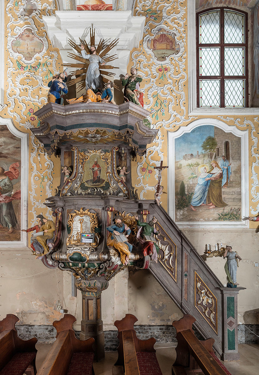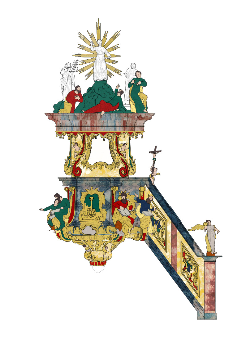Nakon terenskih istraživanja uzorci su obrađeni u Prirodoslovnom laboratoriju HRZ-a, gdje je analizirana stratigrafija te ustanovljena građa i sastav materijala. Usporedbom rezultata sondiranja i podataka iz arhivske građe zaključeno je da se na bočnim oltarima Trpećega Krista i svetoga Petra te na propovjedaonici i ispovjedaonicama, uz sačuvani prvotni barokni oslik, nalazi samo repolikromacija Petra Rutara iz 1904. godine, dok je kućište orgulja obnovljeno još jedanput, osamdesetih godina 20. stoljeća. Nakon interpretacije rezultata istraživanja izrađena je grafička simulacija povijesnih faza pojedinih dijelova inventara. Rezultati istraživanja obuhvaćeni su elaboratom koji uključuje i prijedlog konzervatorsko-restauratorskih radova. (KŠ)