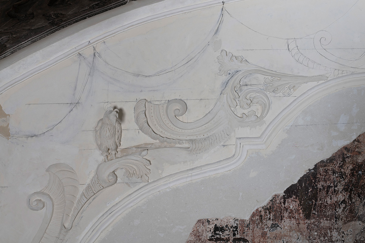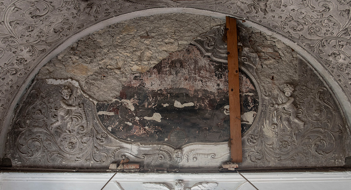 Na svodu je, nakon čišćenja debelih naslaga nečistoća i prljavštine koja se nataložila po svim površinama štukature i njezine podloge, također bilo potrebno injektiranje labilnih i odvojenih dijelova žbuke, nosioca štukature. Zatvorene su brojne veće i manje pukotine po površinama svoda i luneta te su rekonstruirani nedostajući dijelovi profilacija i odlomljeni dijelovi dekorativnih elemenata.
