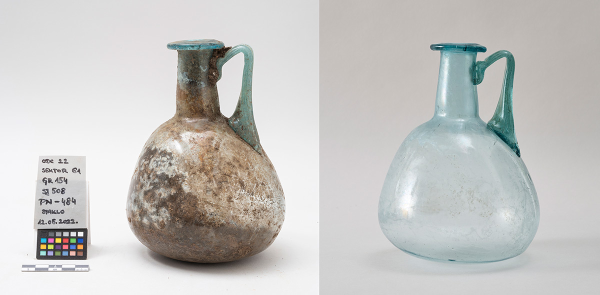 Nastavljen je i pregled brojnih staklenih predmeta. Dio njih potpuno je očuvan, samo prekriven zemljom i kalcifikatom, a velik dio je fragmentiran i zahtijeva dugotrajan pregled, sortiranje i odluke o budućim konzervatorsko-restauratorskim radovima, što je u tijeku. Svi stakleni posebni nalazi ove su godine oprani mekim četkicama; uslijedit će čišćenje blagom kiselinom radi uklanjanja kalcifikata. Riječ je o više stotina staklenih predmeta (staklene urne, boce, balzamariji, čaše, posudice i tanjuri).