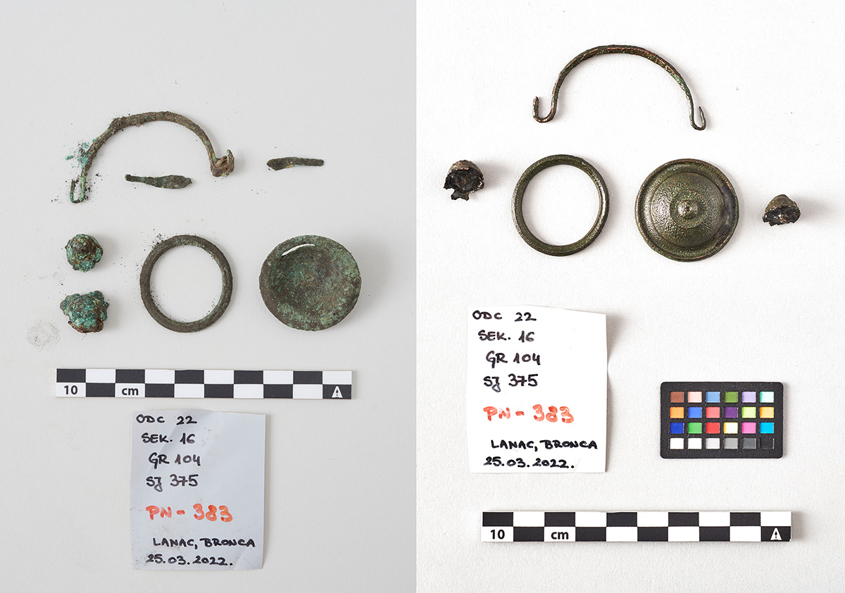 Nastavljeni su i radovi na brončanim predmetima. Mehanički su očišćeni od korozije skalpelom pod binokularnim povećalom, mikropjeskarnikom, mikromotorom ili ultrazvučnom iglom. Predmeti od više ulomaka su lijepljeni, rekonstruirani te završno zaštitno premazani. Završeno je 48 većih i manjih brončanih nalaza, većinom strigila i lanaca.