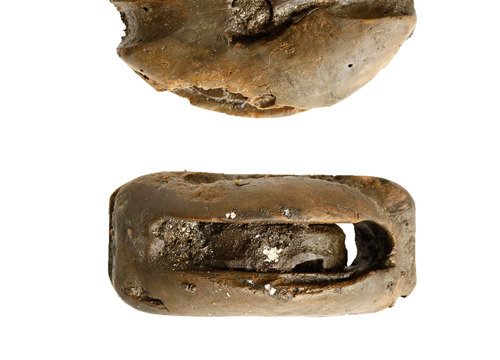 Nedaleko je pronađen i drveni predmet s ručkom nalik na grabilicu za rasuti teret. Na temelju njega može se naslutiti da je, uz teret šalica za kavu, lule za duhan i nargile, brod prevozio i teret rastresite robe, poput kave ili duhana. Svi navedeni segmenti tereta upućuju na to da je riječ o orijentalnom paketu 'proizvoda za slobodno vrijeme', što je uključivalo i egzotične namirnice, poput orijentalnih čajeva, čokolade, kave, duhana i opijuma te rekvizite za njihovu konzumaciju. Takvi paketi redovito su kolali na trgovačkoj trasi iz trgovačkih luka Aleksandrije i Istanbula prema Veneciji i drugim lukama na Zapadu, a brodolom kod Bisaga jedinstven je primjer takve trgovine. Teret broda sa šalicama za kavu, lulama, nargilama, a moguće i sirovinama poput kave ili duhana, također podsjeća na pribor za opremanje kavana. One su se, najčešće po uzoru na orijentalne kavane (tur. kahweh, koltuk kahvesi), od druge polovice 17. stoljeća počele otvarati diljem Europe, a do polovice 18. stoljeća postaju protagonisti društvenog i intelektualnog života na Zapadu. Prema tome, vrlo je moguće da je teret broda bio namijenjen opskrbi kavana. (VZ)