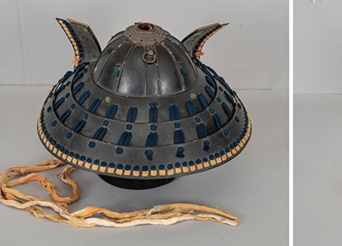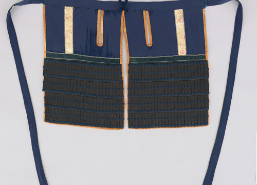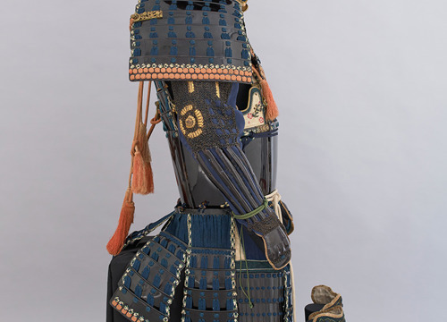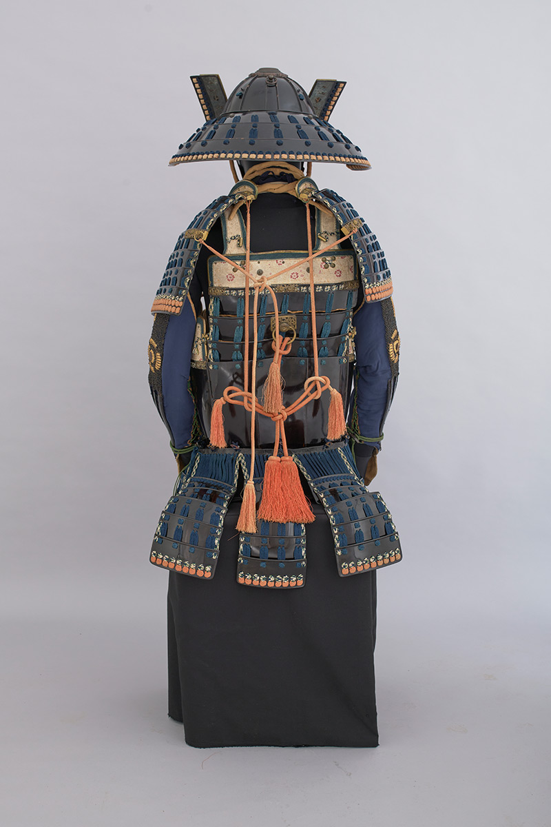 Samurajski oklopi tradicionalno se izlažu na posebnoj drvenoj vješalici postavljenoj na originalnoj kutiji za pohranu, najčešće izrađenoj od drva i kože s utisnutim znakom obitelji. Umjesto drvene vješalice za izlaganje samurajskog oklopa na originalnoj kutiji u ovom je slučaju prilagođen gornji dio lutke. (GC, MBM i MZ)