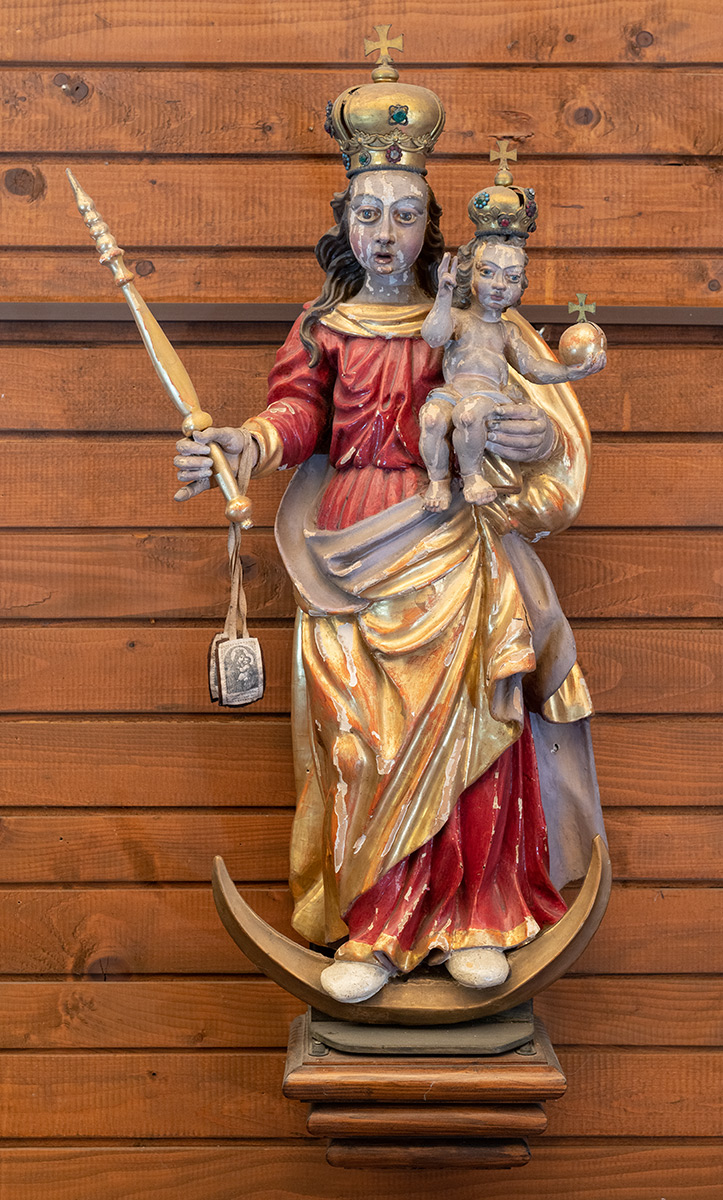 Oltar Sv. Trojstva je do ratne evakuacije 1991. godine bio smješten na sjevernoj strani crkve sv. Marka evanđelista, odnosno "na strani Evanđelja" (vizitacija iz 1692. godine). Jednokatni oltar tektonskog tipa sastoji se od predele, retabla i atike. Retabl s atikom postavljen je na visoku predelu s kubično istaknutim postamentima glatkih stupova retabla, jednostavnih okruglih baza i kompozitnih kapitela. Tijela stupova su s gornje i donje strane ukrašena plitkom rezbarijom koja kombinira motive geometrijskog i vegetabilnog ornamenta koji se razvlači u vitičaste preplete. U središtu pravokutnog retabla nalazi se polukružno zaključena niša sa skulpturom s prikazom Bogorodice koja stoji na polumjesecu, lijevom rukom pridržava malog Isusa, a u desnoj drži žezlo. Pozadina niše iza Bogorodice ukrašena je rezbarenim zrakama. Na glavama Bogorodice i Isusa nalaze se metalne krune. Iznad niše su dva hrskavičasta cvijeta. Retabl rube uholika oltarna krila s viticama ukrašenima motivima hrskavica. Iznad retabla je vijenac poduprt stupovima. Vijenac se sastoji od friza s rezbarenim vitičastim prepletom u sredini i rezbarenim cvjetovima na kubično istaknutim rubovima, te od arhitrava jednostavne vučene profilacije koji se na rubovima kvadratično izvlači u prostor. Na vijenac je smještena niska pravokutna atika u čijem je središtu slika "Sv. Trojstvo". Slika je bočno omeđena dvjema rezbarenim konzolama s rezbarenim motivima palmeta koje podupiru lomljeni zabat u obliku voluta koje se na unutarnjim krajevima razvlače u vitičastu vrpcu ukrašenu shematiziranim motivom hrskavice. Na rubovima atike nalaze se konzole u obliku voluta na koje su smještene skulpture sv. Barbare i nepoznate svetice.