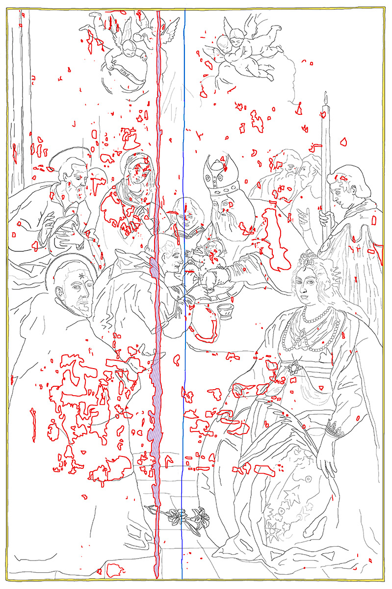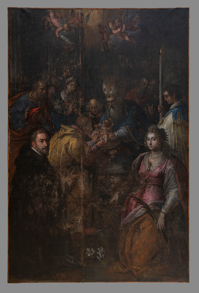 Neosporno visokokvalitetno djelo mletačkoga setecenta zatečeno je u lošem stanju. Dokumentiran je rad austrijskoga restauratora Ritschla koji 1912. godine sliku zatječe zalijepljenu na drvenu dasku izjedenu crvotočinom. Iste je godine slika prebačena na novi tekstilni nosilac, uz izvedeni retuš i lakiranje. Programom započetim 2021. godine (voditeljica: Ratka Kalilić, Restauratorski odjel Split) željelo se konzervatorsko-restauratorskim radovima pridonijeti očuvanju originalnih slojeva umjetnine te postići vizualnu i estetsku cjelovitost. Nakon cjelovitih istraživačkih radova, koji su uključivali ispitivanje površine i analizu strukture i sastava slikanih slojeva, odlučeno je da se uklone zatečeni potamnjeli lak i preslike izvedene tijekom austrijske restauracije. Kao povijesni dokument i izvor informacija o metodologiji i materijalima primijenjenima u povijesnoj restauraciji, zadržano je povijesno podstavljanje platnom. Platneni nosilac je izravnat i ponovno napet na originalni, restaurirani drveni podokvir. Sva oštećenja i nedostaci u sloju preparacije ispunjeni su kitom, a nove su površine obrađene tako da njihova tekstura odgovara okolnoj izvornoj površini. Za integraciju prepariranih zona bilo je potrebno rekonstruirati oštećenja bojenog sloja smeđim gvašem, koji imitira izvornu imprimaturu. Podslik je izveden samo na mjestima na kojima boje sadrže bijelu, što je rezultiralo svjetlijim tonom na tim područjima. Nakon zaštite cijele površine slojem izolacijskog laka, pristupilo se retušu smolnim lazurama te integraciji s izvornim oslikom. Cijela površina slike zaštićena je završnim slojem laka. (RK)