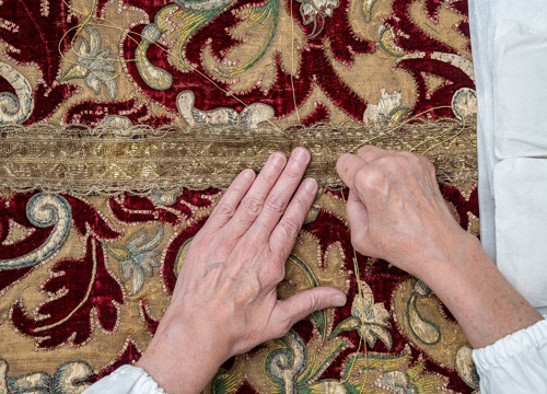 Tijekom konzervatorsko-restauratorskih radova 2020. godine (voditeljica Sandra Lucić Vujičić, Odjel za tekstil, papir i kožu, Služba za pokretnu baštinu) otkriveni su fragmenti svilenih tkanina iz 16. i 18. stoljeća kojima su nadomješteni nedostajući dijelovi izvornih tkanina te dvije vrste ukrasnih mesinganih traka. Izvorna dekoracija zavjese izrađena je tehnikom veza a riporto, upotrebom svilenih tkanina i papira, pozlaćenih i frisé uzica te raznobojnih svilenih niti. S obzirom na nove podatke, moguće je s velikim oprezom pretpostaviti dataciju katapetazeme u prijelaz 16. u 17. stoljeće, dok se izvezena godina može povezati s posljednjom većom intervencijom. Također se može pretpostaviti da je za izradu katapetazme 1800. godine upotrijebljeno nekoliko materijala.