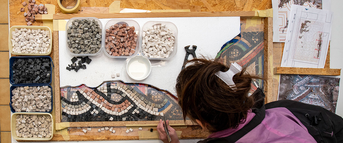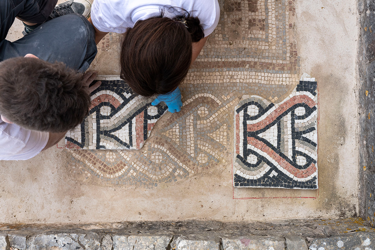 Nepredvidivi djelomični ili potpuni gubitak ostataka mozaika in situ zahtijevao je ekspeditivnost pri njegovu stabiliziranju/konsolidiranju s ciljem očuvanja materijalnog i duhovnog integriteta. Stabiliziranje/konsolidiranje je podrazumijevalo: konsolidiranje lica mozaika i dizanje mozaika s izvornog mjesta prema planu rezova, konsolidiranje poleđine ulomaka u radionici, čišćenje i pripremanje prostorije za prihvat mozaika, postavljanje nove žbukane podloge u obuhvatnoj zoni, pozicioniranje mozaika in situ, čišćenje lica mozaika od zaštitnog sloja, postavljanje završne žbuke između ulomaka mozaika i konsolidiranje lica mozaika. Konsolidiranje lica mozaika izvedeno je različitim metodama i tehnikama (injektiranje, konsolidiranje mehaničkih oštećenja i sljubnica/fuga te impregniranje lica mozaika). Nakon vraćanja stabiliziranih izvornih mozaika in situ, uslijedila je sljedeća radna faza u radionici – izrada replike/rekonstrukcije dijela mozaika i njegovo postavljanje in situ. Za izradu novih ulomaka izrađen je detaljni grafički crtež/predložak sa shemom likovne geometrijske dekoracije mozaika u odnosu na izvorni mozaik. Predložak je izrađen u mjerilu 1 : 1 i sastavljen je plan/nacrt izrade s budućim ulomcima rekonstrukcije. Rekonstrukcija je izrađena u pet različitih dijelova/ulomaka određene veličine radi lakše manipulacije pri izradi, postavljanja in situ i lakšeg transporta iz radionice do nalazišta. Nakon izrade crteža, ručno su izrađene kockice od prirodnog kamena lokalnog porijekla, koje su poslužile za izradu novih ulomaka tzv. indirektnom metodom. Prije postavljanja replika in situ, ulomci su probno postavljeni u obuhvatno područje; pritom se pazilo da slijede likovnu dekoraciju i visinsku razliku između izvornih mozaika. Nakon utvrđivanja svih navedenih činjenica, postavljen je žbukani prihvatni sloj između podloge i ulomaka. Kad je postignuta kompatibilnost ulomaka i podloge, uslijedilo je mehaničko-kemijsko čišćenje površine te izrada retuša s izvornim kockicama na mjestima većih mehaničkih oštećenja, kao i na spoju izvornih i novih ulomaka mozaika. Novonastala mozaična površina fugirana je adekvatnom vapnenom žbukom, dodatno je očišćena kemijski neutralnim sredstvima i naposljetku impregnirana. (IJ)