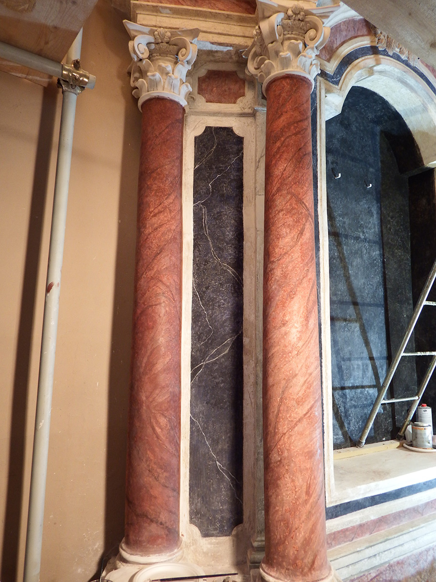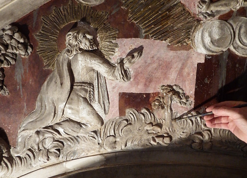 Započelo se i s retušem slikanih površina oltara, što će biti završeno do kraja godine. Korišteni su praškasti pigmenti razrijeđeni tilozom. Na atici oltara, dio reljefnog prikaza bio je pozlaćen. Kemijskom analizom utvrđeno je da se radi o umjetnoj pozlati, koja je na taj način i obnovljena.