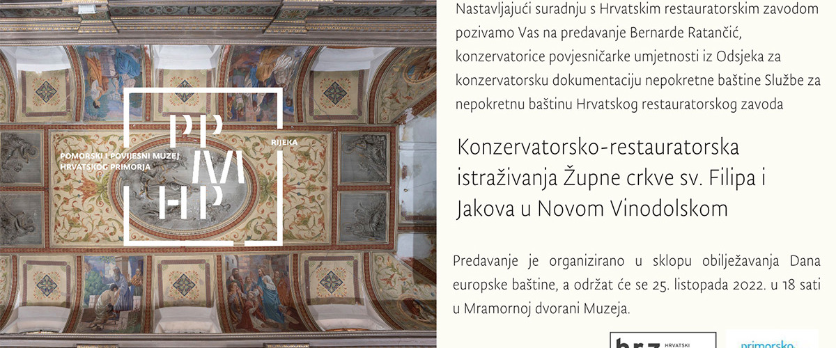 Hrvatski restauratorski zavod i Pomorski i povijesni muzej Hrvatskog primorja Rijeka pozivaju Vas na predavanje Bernarde Ratančić Konzervatorsko-restauratorska istraživanja Župne crkve sv. Filipa i Jakova u Novom Vinodolskom koje će se održati 25. listopada 2022. u 18 sati u Mramornoj dvorani Muzeja.