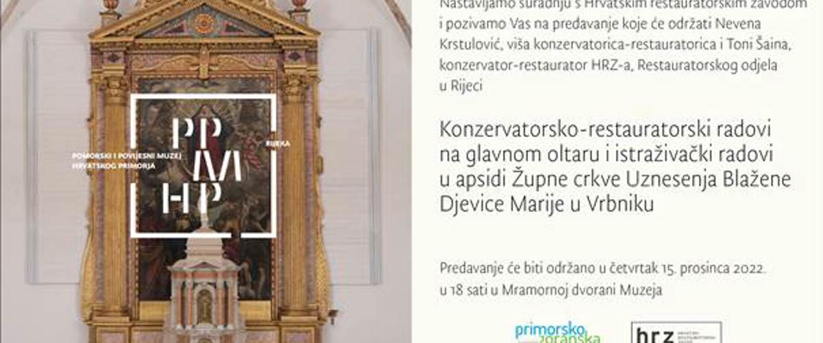 Hrvatski restauratorski zavod i Pomorski i povijesni muzej Hrvatskog primorja Rijeka pozivaju Vas na predavanje Konzervatorsko-restauratorski radovi na glavnom oltaru i istraživački radovi u apsidi župne crkve Uznesenja Blažene Djevice Marije u Vrbniku koje će se održati 15. prosinca 2022. u 18 sati u Mramornoj dvorani Muzeja.