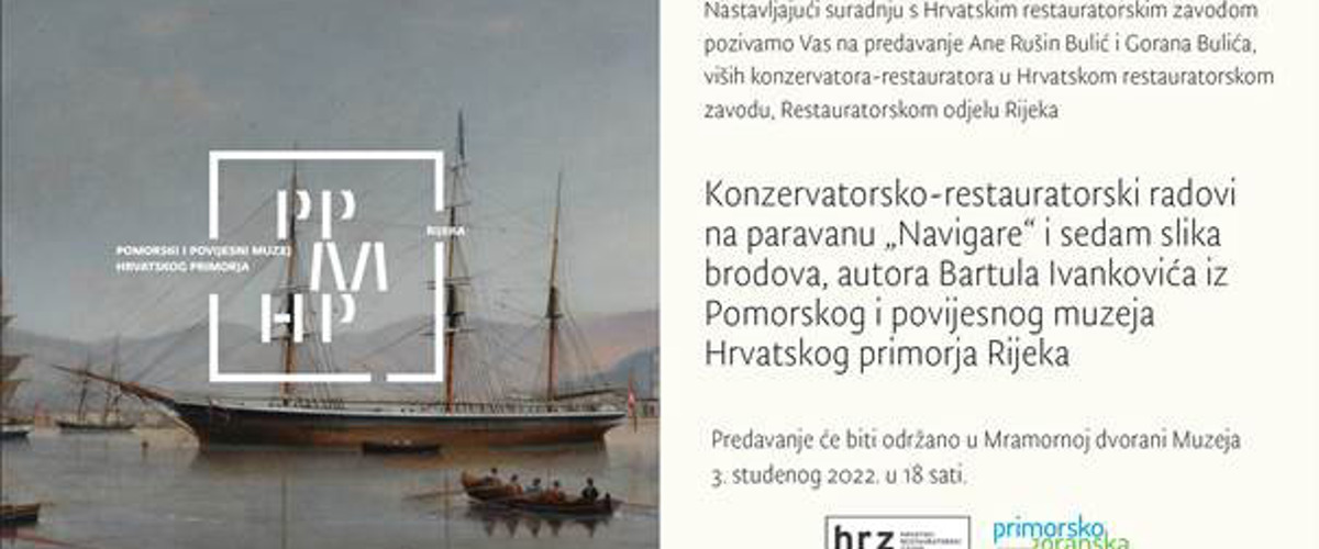 Hrvatski restauratorski zavod i Pomorski i povijesni muzej Hrvatskog primorja Rijeka pozivaju Vas na predavanje Konzervatorsko-restauratorski radovi na paravanu "Navigare" i sedam slika brodova, autora Bartula Ivankovića iz Pomorskog i povijesnog muzeja Hrvatskog primorja Rijeka koje će se održati 3. studenog 2022. u 18 sati u Mramornoj dvorani Muzeja.