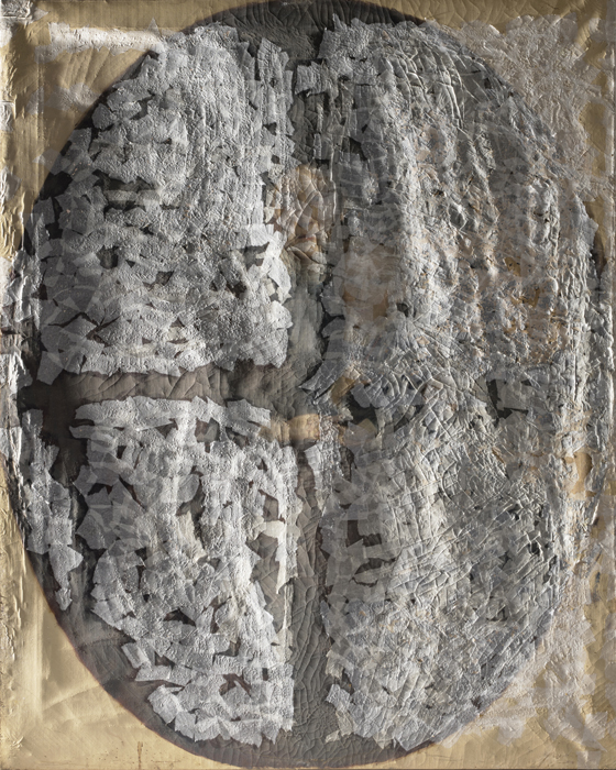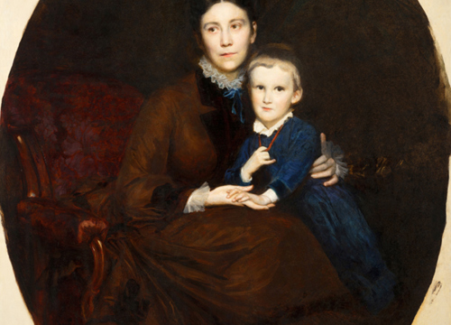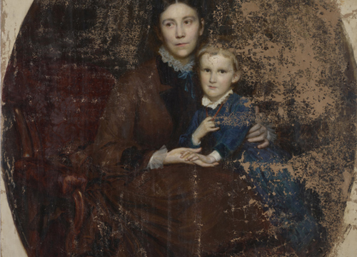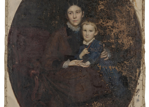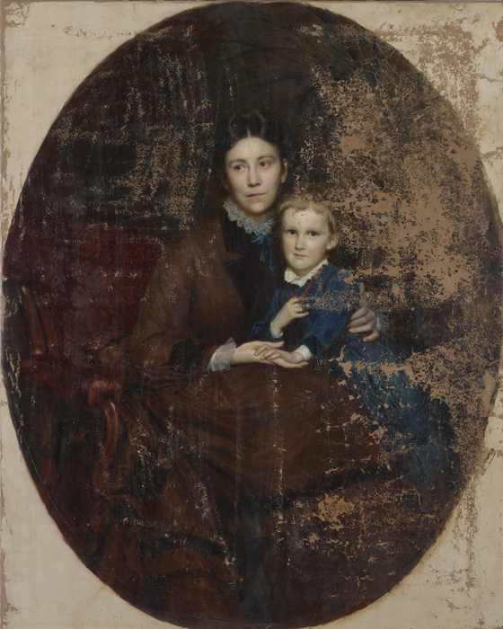 Na slici ovalnog formata, u pravokutnom profiliranom pozlaćenom okviru s drvenim ovalnim paspartuom, prikazana je mlada žena u naslonjaču sa sinom Martinom koji joj sjedi u krilu. Pretpostavlja se da je riječ o Emmi Leitner, rođ. Tuszkau (1844.–1916.). Slika je bila u iznimno lošem stanju zbog nepovoljnog utjecaja vlage, osjetljivosti sloja podloge i neadekvatnih mikroklimatskih uvjeta. Najveći dio izraženih oštećenja i gubitaka slikanog sloja i podloge nalazio se na desnoj polovici slike. Veća oštećenja slikanog sloja i podloge bila su i na čelu portretiranog dječaka i njegovoj plavoj opravi. Tutkalno-kredna podloga na koju je položen bolus i slikani sloj na bazi lanenog ulja, zbog oštećenja, velikim dijelom se lako odvajao od podloge. Na površini slike bila je vidljiva izražena, gusta i raznolika mreža starosnih pukotina u slikanom sloju. Zbog velikoga gubitka i oštećenja, slikani sloj je u Muzeju preventivno zaštićen japanskim papirom.