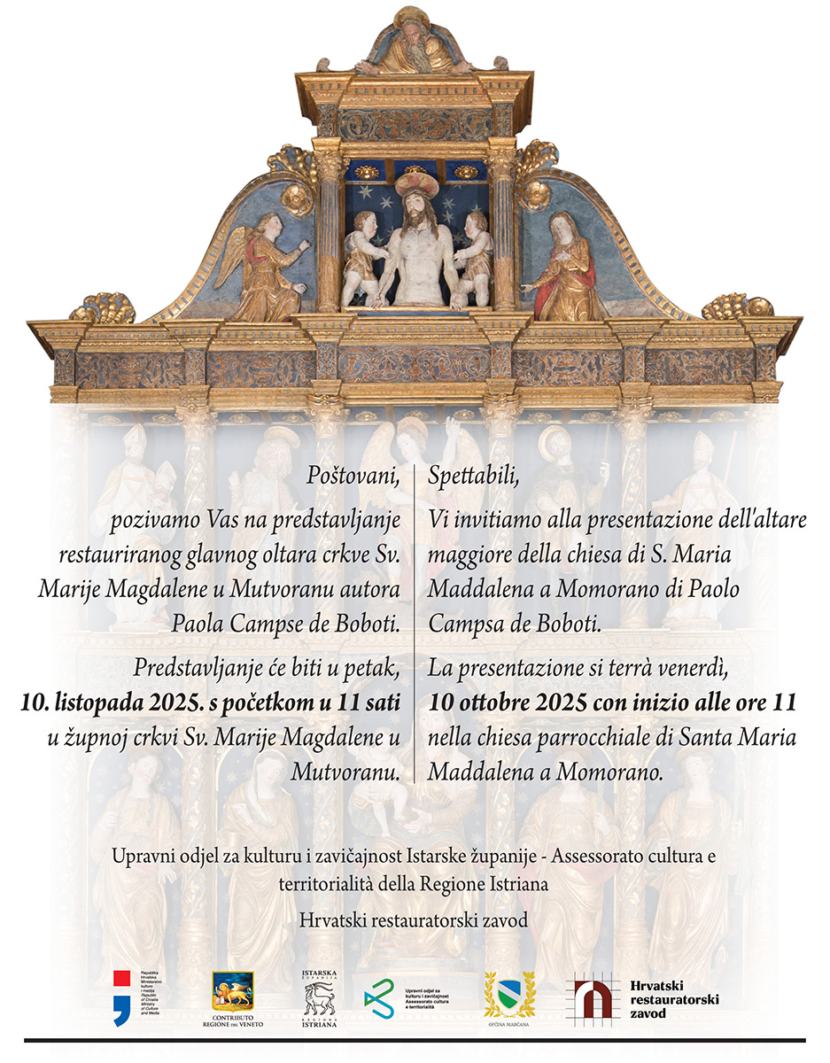 Istarska županija – Regione Istriana i Hrvatski restauratorski zavod imaju čast pozvati Vas na predstavljanje dovršenih konzervatorsko-restauratorskih radova na glavnom oltaru župne crkve sv. Marije Magdalene u Mutvoranu. Predstavljanje će se održati 10. listopada s početkom u 11 sati u župnoj crkvi u Mutvoranu.
