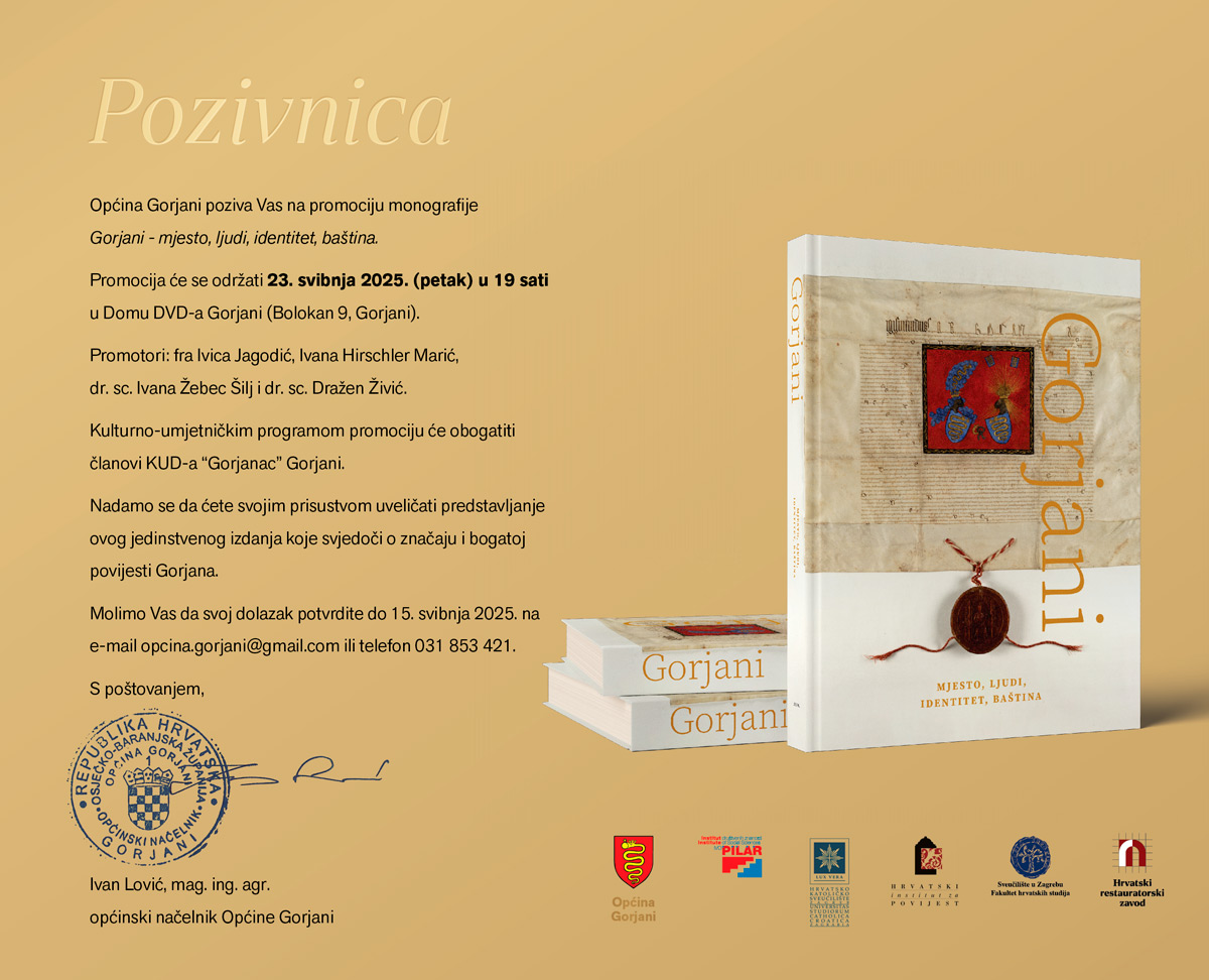 Hrvatski restauratorski zavod i Općina Gorjani imaju zadovoljstvo pozvati Vas na predstavljanje monografije Gorjani – mjesto, ljudi, identitet, baština koje će se održati u petak, 23. svibnja 2025. godine u 19 sati u Domu DVD-a Gorjani, Bolokan 9, Gorjani.