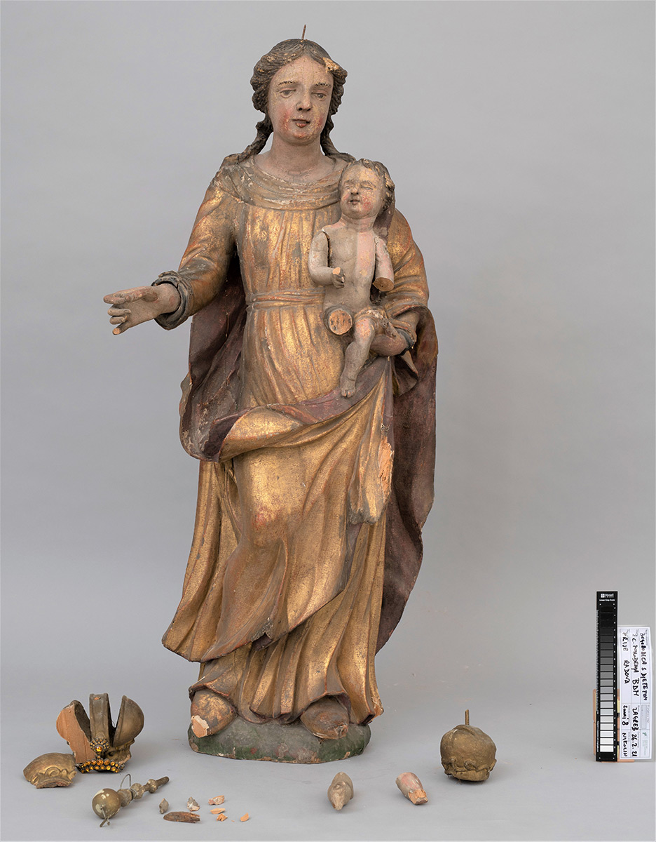 Skulptura Bogorodice s Djetetom teško je stradala u potresu kad joj se nakon pada odlomilo više dijelova: kruna i žezlo Bogorodice, mali prst desne ruke, vrh cipele, kruna malog Isusa, desna noga, lijeva ruka, prsti desne ruke. Skulptura je evakuirana i smještena u čuvaonicu umjetnina Zavoda. Površina je bila prekrivena slojem nečistoće s mnogim vidljivim mehaničkim oštećenjima. Zatečene su intervencije iz prethodnih zahvata: diskolorirani popravci premaza metalizirane imitacije zlata na zlatu, kao i djelomično preslikani dijelovi inkarnata.