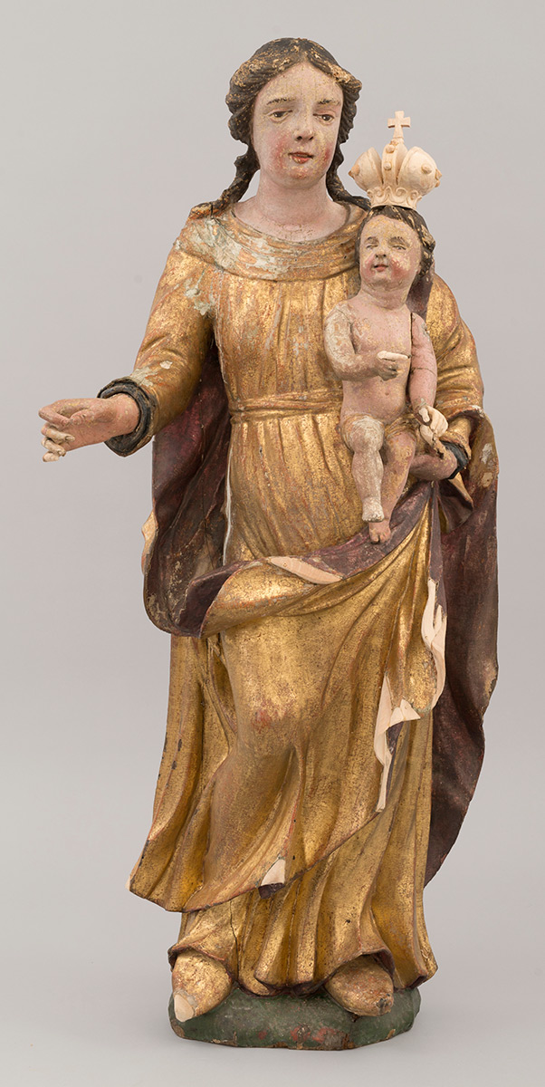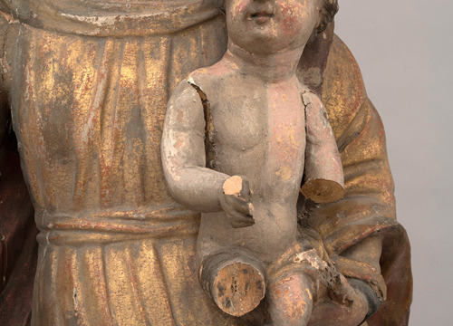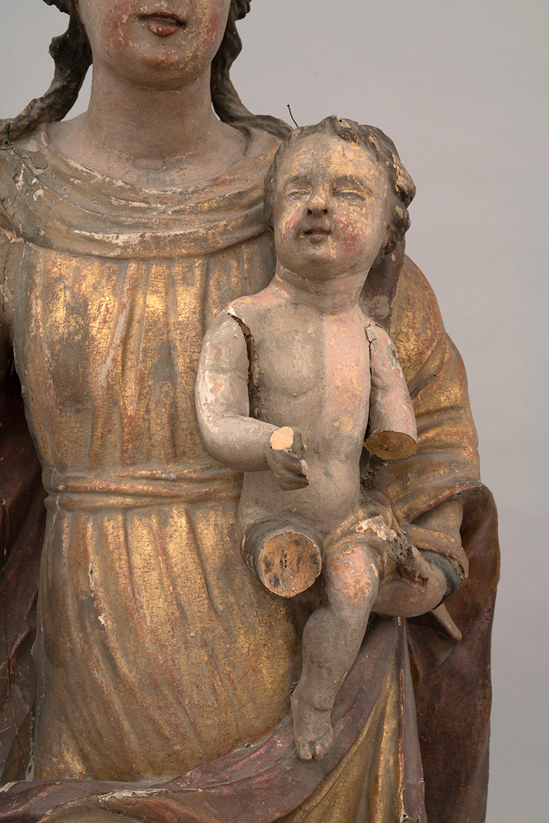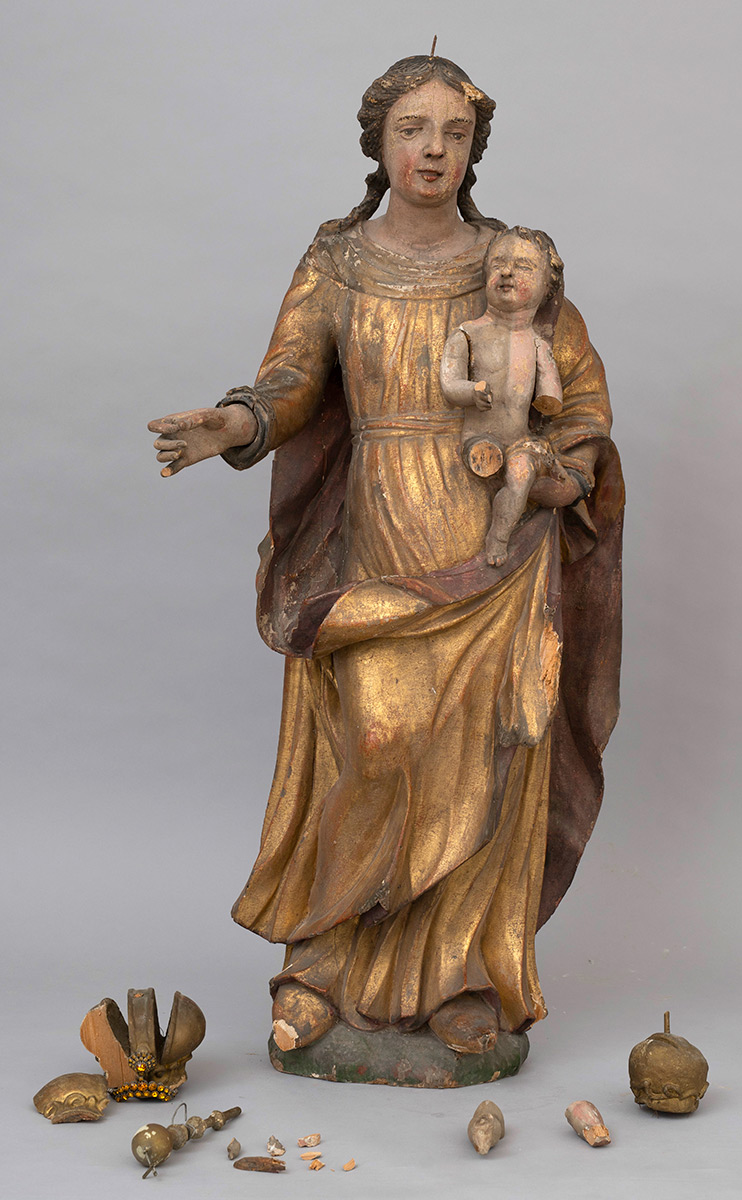 Skulptura je evakuirana i smještena u čuvaonicu umjetnina Hrvatskog restauratorskog zavoda. Ustanovljeno je da je odlomljeno više dijelova: Bogorodičina kruna i žezlo, mali prst njezine desne ruke, vrh cipele, kruna maloga Isusa, njegova desna noga, lijeva ruka te prsti desne ruke. Površina skulpture bila je prekrivena slojem nečistoće, s mnogim vidljivim mehaničkim oštećenjima. Na skulpturi su zatečeni tragovi prethodnih intervencija, uključujući diskolorirane popravke pozlaćenih površina i djelomično preslikane dijelove inkarnata, kao i kasnije dodatke, poput Djetetove krune i žezla.