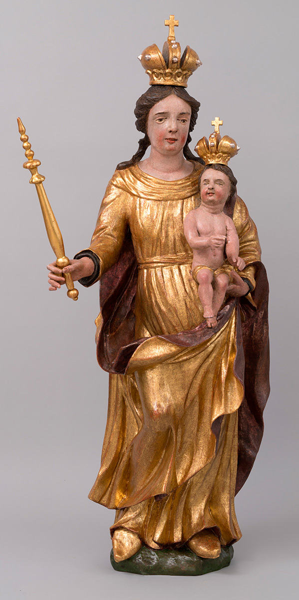 Skulptura Bogorodice s Djetetom smještena je na postamentu iznad svetohraništa mramornoga glavnog oltara crkve, koji je datiran u 1768. godinu i pripisan Franji Rottmanu (1710. – 1788.). Bogorodica je prikazana u blagom kontrapostu, s Djetetom u naručju i žezlom u poluispruženoj desnoj ruci. Odjevena je u dugačku, lagano nabranu haljinu stegnutu u struku pojasom i ogrnuta raskošnim plaštem. Kosa joj je začešljana po sredini i upletena u punđu, a dva dugačka uvojka spuštaju se na ramena. Bogorodica i Dijete su okrunjeni. Na izdubljenoj pozadini skulpture vidljive su oznake koje govore o nekadašnjim vlasnicima: inventarni broj DM 1124 upućuje na to da je skulptura bila dio zbirke Dijecezanskog muzeja, dok natpis Sv. Ivan Žabno govori o provenijenciji iz župne crkve sv. Ivana Krstitelja u mjestu Sveti Ivan Žabno u okolici Križevaca.