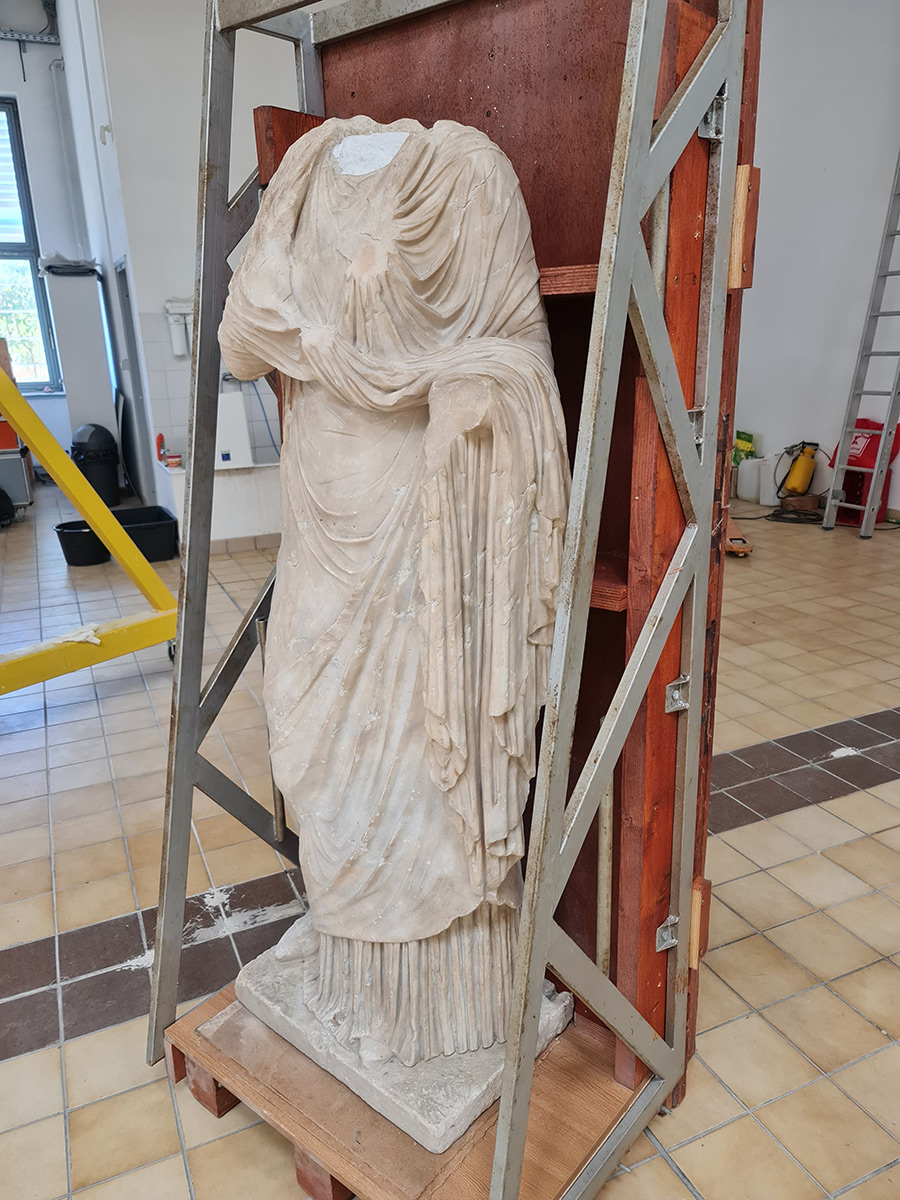 Istraživanja koja provodi Hrvatski restauratorski zavod obuhvaćaju i mjerenje vodoupojnosti kamena, analizu prisutnosti štetnih topivih soli, probe čišćenja kamena, povijesno-umjetničku analizu te detaljno dokumentiranje zatečenog stanja uz 3D lasersko skeniranje. Radovi na kamenim spomenicima s opuzenskog trga izvode se in situ, ali je skulptura carice Livije transportirana u radionicu Dračevac, gdje će se nastaviti konzervatorsko-restauratorski radovi. (HU)
