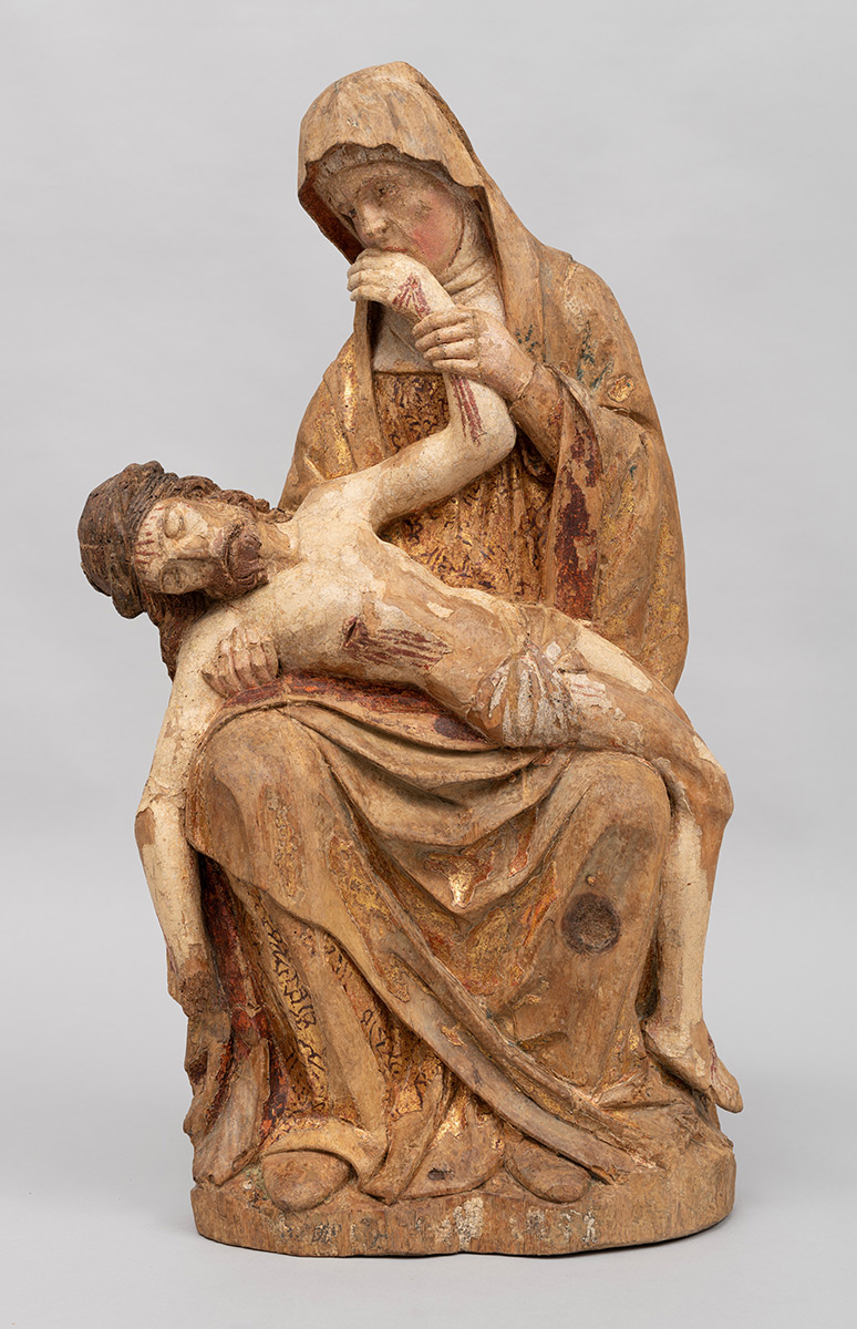 Drvena polikromirana skulptura Pietà datirana je u 15. stoljeće, ali su njezin izvorni smještaj i porijeklo i dalje nepoznanica, iako kulturne i trgovačke veze Raba, kao i karakteristike skulpture upućuju na venecijanske radionice. Pietà kao jedna od najpopularnijih kršćanskih tema potvrda je promjene duhovne klime u Europi oko 1300. godine, kad se istražuje ljudskost božanstva, Krista kao djeteta, sina ili običnog smrtnika. Prvi primjeri te teme pojavljuju se na području rijeke Rajne, odakle se šire po drugim krajevima Njemačke, Flandrije i Francuske, ali i bliže nama, do Slovenije, Istre, Venecije i Italije, gdje taj medijevalni ikonografski motiv tijekom renesanse doseže vrhunac u plastici.
