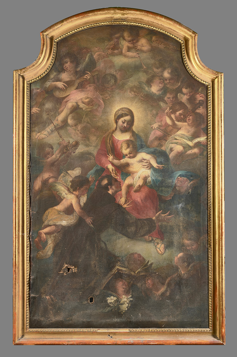 U središte kompozicije smještena je Bogorodica s Djetetom u naručju, lebdeći na oblacima. Obasjana je zrakama svjetla, a jedan od brojnih anđela koji je okružuju dodaje joj žezlo i krunu. Ispod nje kleči sv. Antun Padovanski u franjevačkom habitu, raširenih ruku, obraćajući joj se naglašenom gestom, u vjerskom zanosu. Središnja scena uokvirena je razigranim likovima anđela svirača u gornjoj i anđeoskim glavicama u donjoj zoni. U prvom planu je otvorena knjiga i bijeli ljiljan, svečevi atributi.