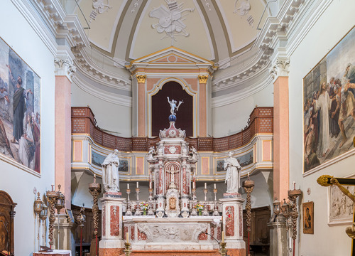 Postojeća crkva sv. Antuna opata posvećena je 1774. godine, a orijentirana je u smjeru sjever – jug. Crkva je jednobrodna s dubokim svetištem zaključenim polukružnom apsidom u kojoj je konzolno istaknuto pjevalište. Crkveni zidovi su raščlanjeni parovima pilastara velikoga reda, o koje se oslanja bogato profiliran istaknuti vijenac. Veliki svod nad lađom ukrašen je zidnim slikama s dekorativnim štukookvirima, dok je u sredini svoda svetišta slika na platnu autora Francesca Maggiota, uokvirena reljefnom štukodekoracijom koju je izveo Clemente Somazzi.