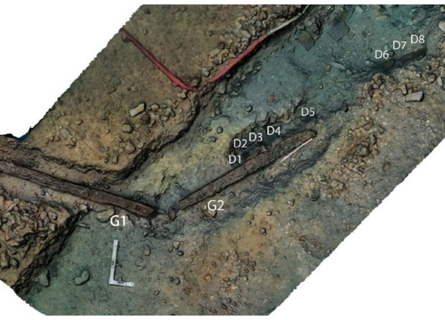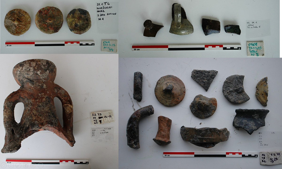 Na iskopanom području od 320 m² pronađeno je dvjesto arheoloških nalaza koji se mogu definirati i tipološki odrediti. Riječ je o različitim dijelovima amfora (grla tipa Portorecanati/Unije, bifidnim ručkama amfora tipa Dressel 2-4, globularna rebrasta tijela amfora tipa Late Roman 1, ulomci sjevernoafričkih amfora i tipa Spatheon), čepova amfora (izrađenih i na kolu i u kalupu), fino izrađenoj helenističkoj keramici crnog premaza (kupe i zdjelice sačuvane u cijelom profilu), keramici tipa terra sigillata (zdjelice i ulomci tanjura) te glaziranoj novovjekovnoj keramici proizvedenoj u sjevernoj Italiji (različiti uzorci boja i ureza na ulomcima zdjelica, vrčeva i većih posuda). Uz pokretne nalaze, tijekom iskopa u sektoru 3 pronađene su dvije veće grede dimenzija 4 m dužine i presjeka 30 x 30 cm, postavljene u smjeru izmjene plime i oseke. Grede su ojačane vertikalno postavljenim daskama i glinom žute boje koja se ne javlja na drugim mjestima na nalazištu. S obzirom na njihove dimenzije, vrlo vjerojatno su postavljene zato da usmjere morske struje u kanalu i učvrste lošinjsku stranu obale.