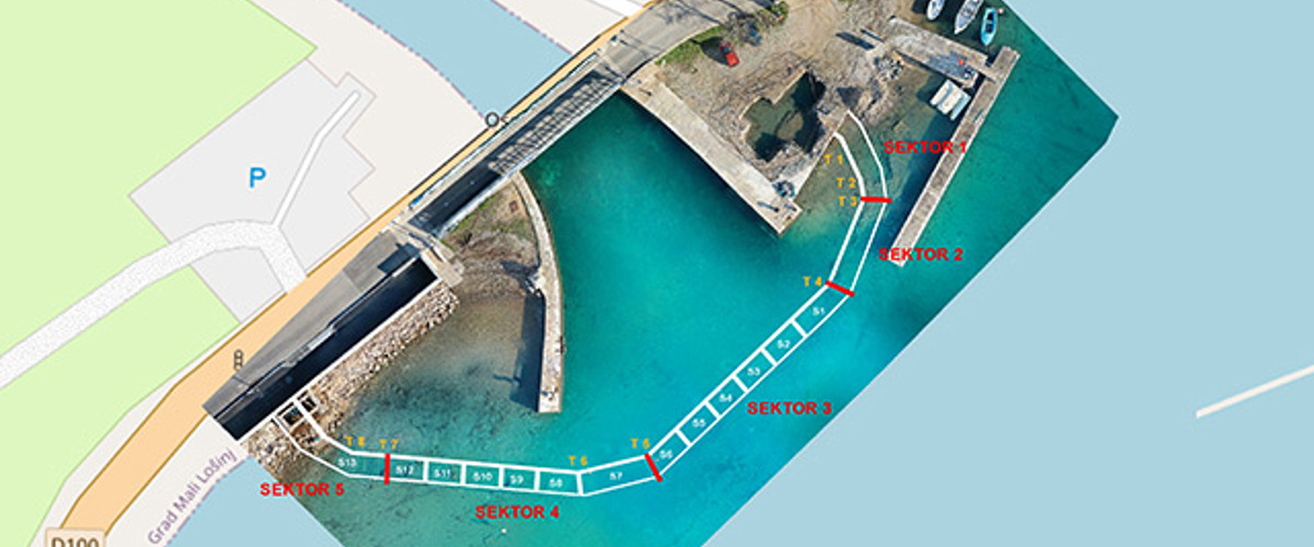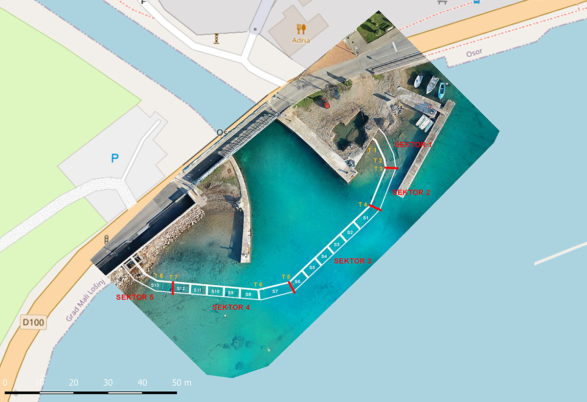 Sektor 1 i sektor 2 nalaze se na creskoj strani trase iskopa. S obzirom na to da je riječ o naknadno nasipanom području uz samu obalu, u sektoru 1 nisu pronađeni nikakvi arheološki ostaci, dok je u sektoru 2 pronađeno desetak drvenih pilona koji su učvršćivali kameni nasip. Slična situacija je i u sektorima 4 i 5, s tim da se sektor 5 nalazi uz samu obalu otoka Lošinja i uglavnom je nasipan krupnim kamenom. U sektoru 4 pronađeno je tridesetak drvenih pilona koji su učvršćivali lošinjsku obalu koja je muljevita i pjeskovita, za razliku od creske koja je kamenita. Razlog tome su morske struje koje su jače na creskoj strani, pa zato nema toliko taloženja sedimenata kao na lošinjskoj. Osim toga, kako je riječ o plovnom putu, kanal između Cresa i Lošinja često se mehanički čisti i produbljuje do 4 m dubine.